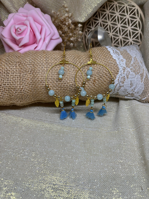 Boucles d’oreilles créoles en Amazonite 6mm et 4mm avec breloque feuilles et pompons en acier
