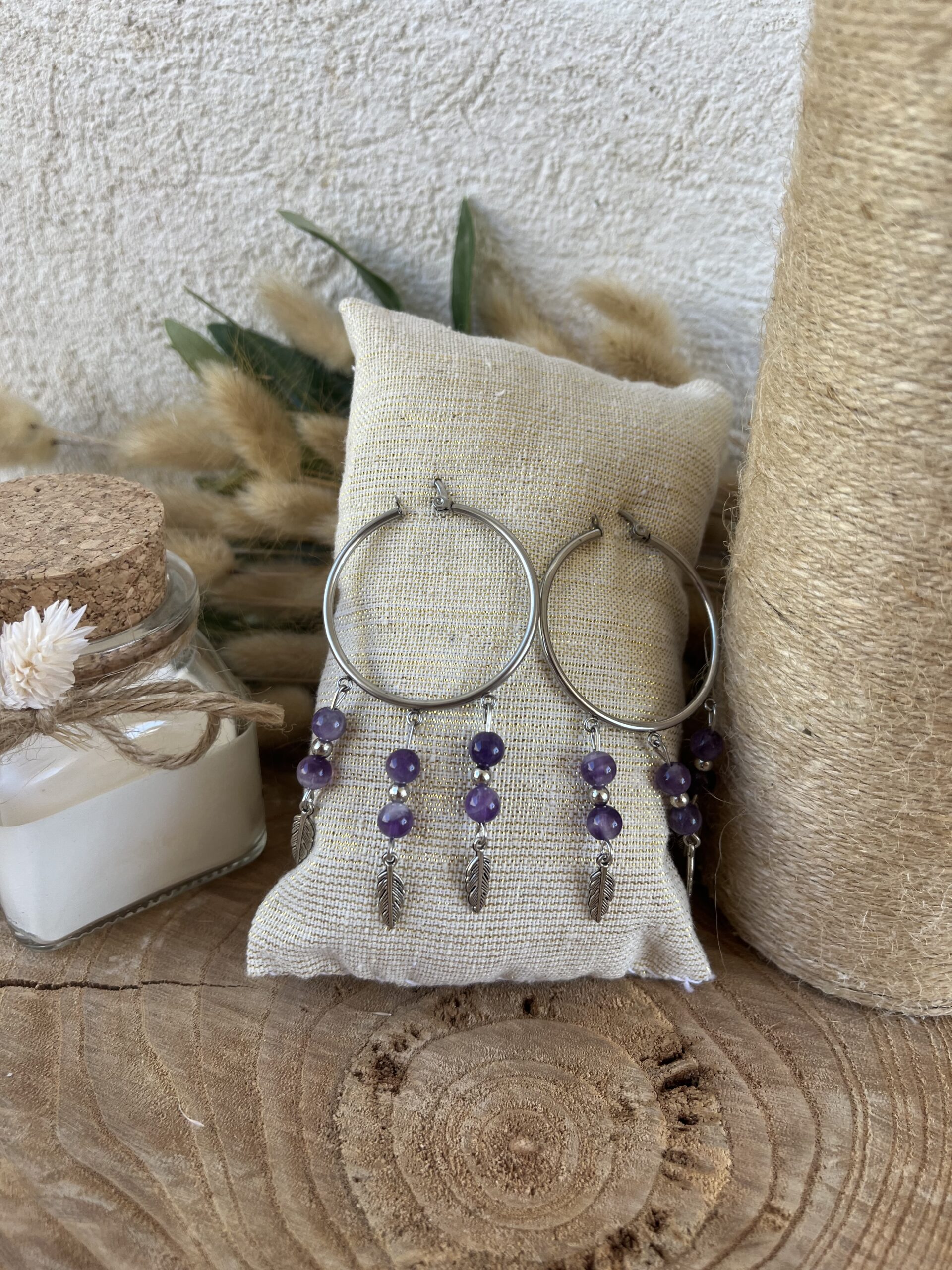 Boucles d’oreilles créoles en Améthyste 6mm, avec breloques plumes en acier inoxydable finition argenté.