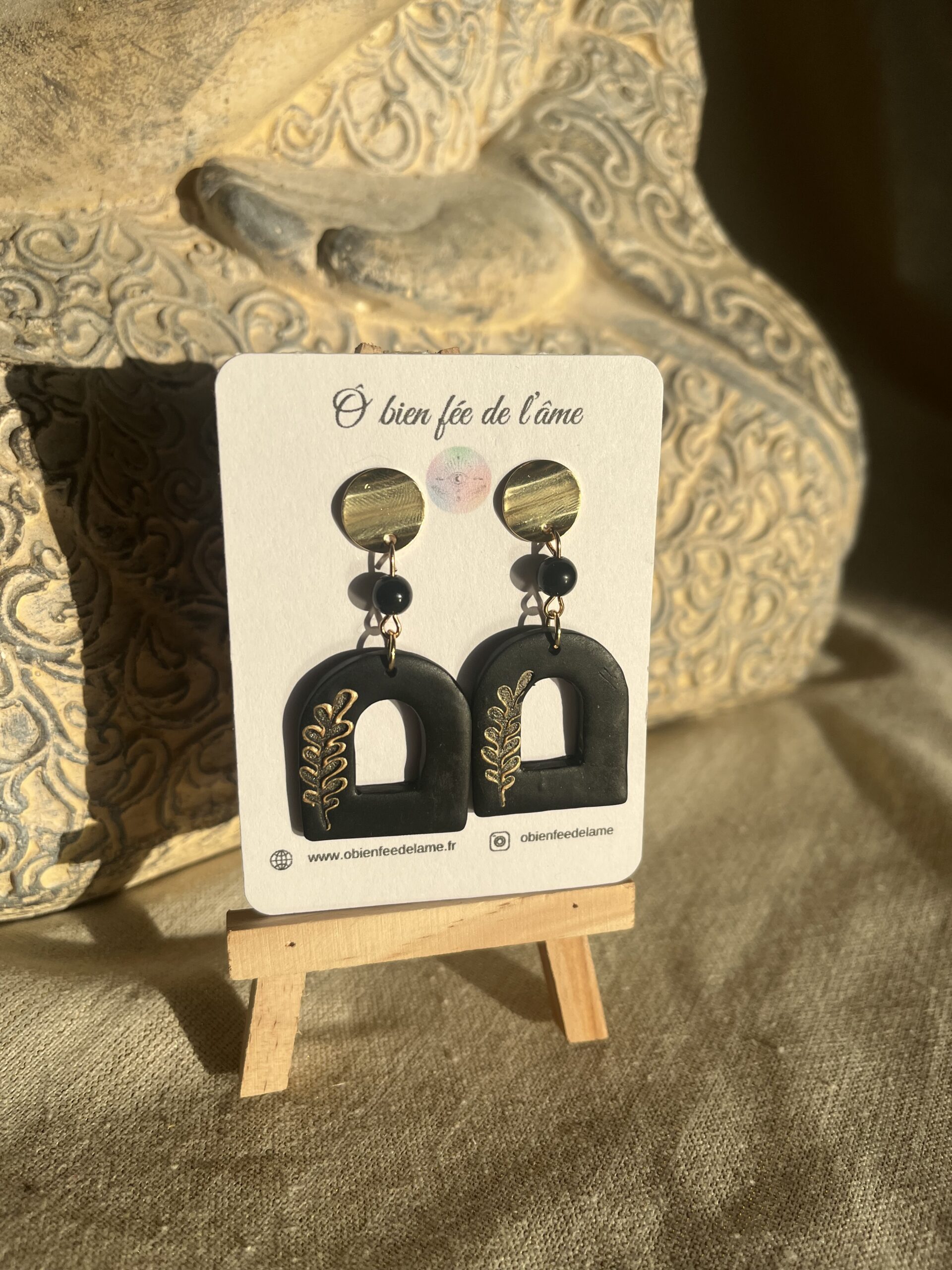 Boucles d’oreilles « Anaya » en argile polymère couleur noir et or, avec pierre naturelle obsidienne en 6mm et attache rond en acier inoxydable doré.