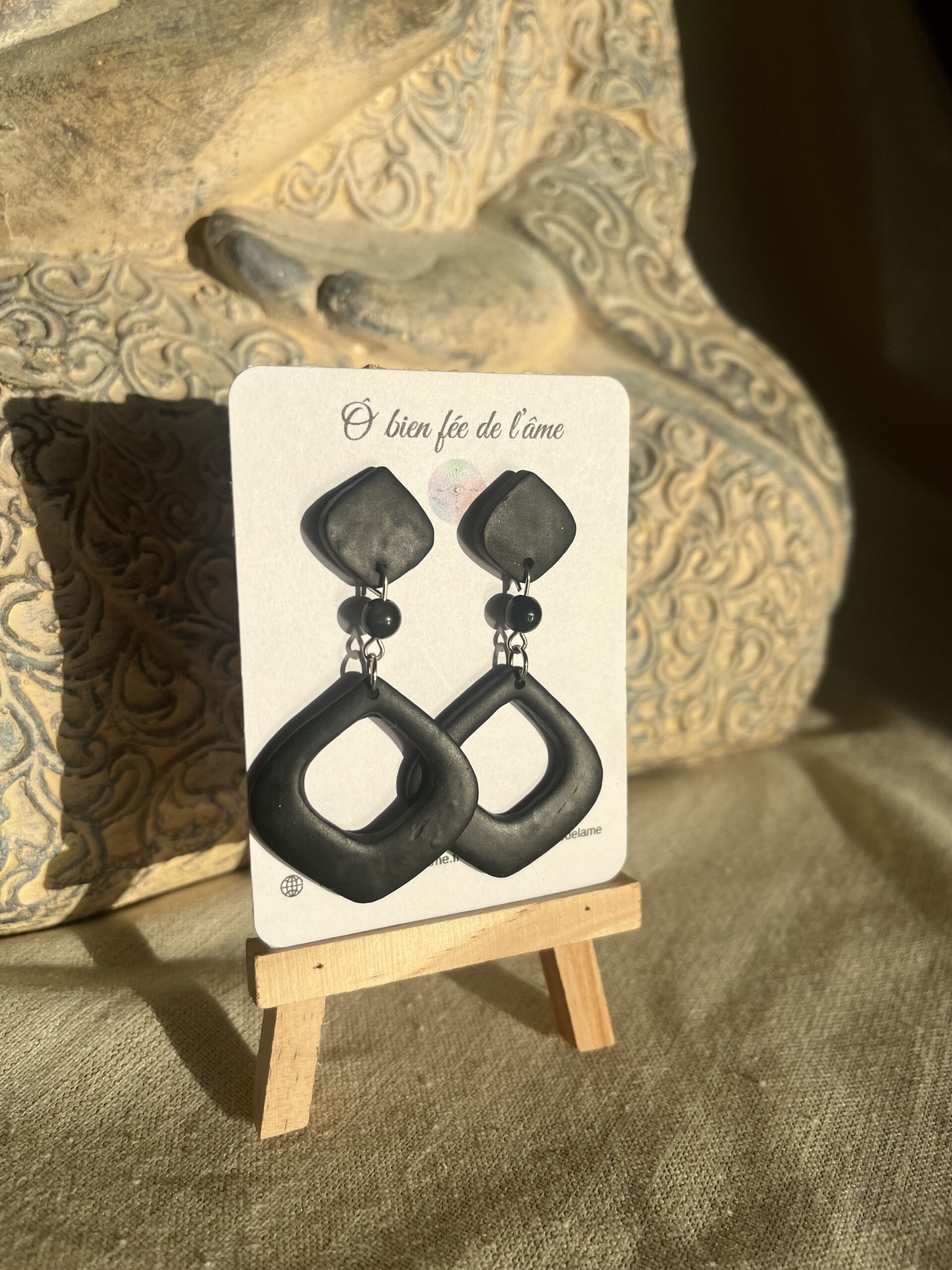 Boucles d’oreilles « Ayla » en argile polymère couleur noire, avec pierre naturelle obsidienne en 6mm et attache en argile polymère.