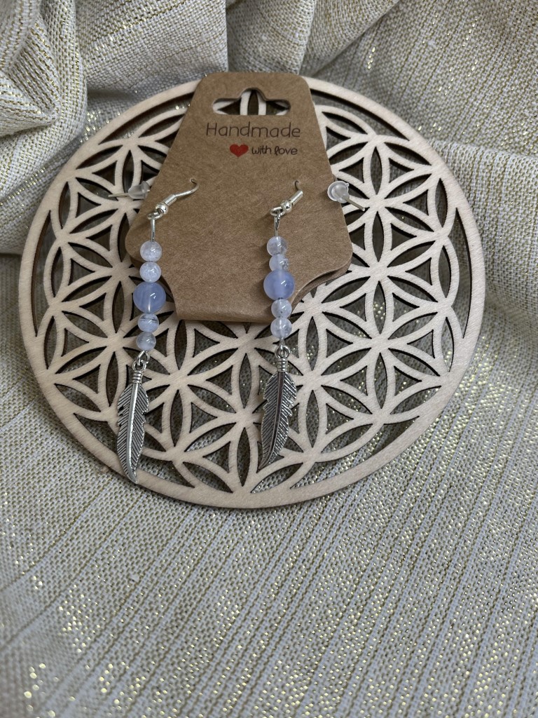 Boucles d’oreilles pendantes en Calcédoine perles 4mm et 6mm avec breloque plume en acier inoxydable finition argenté.