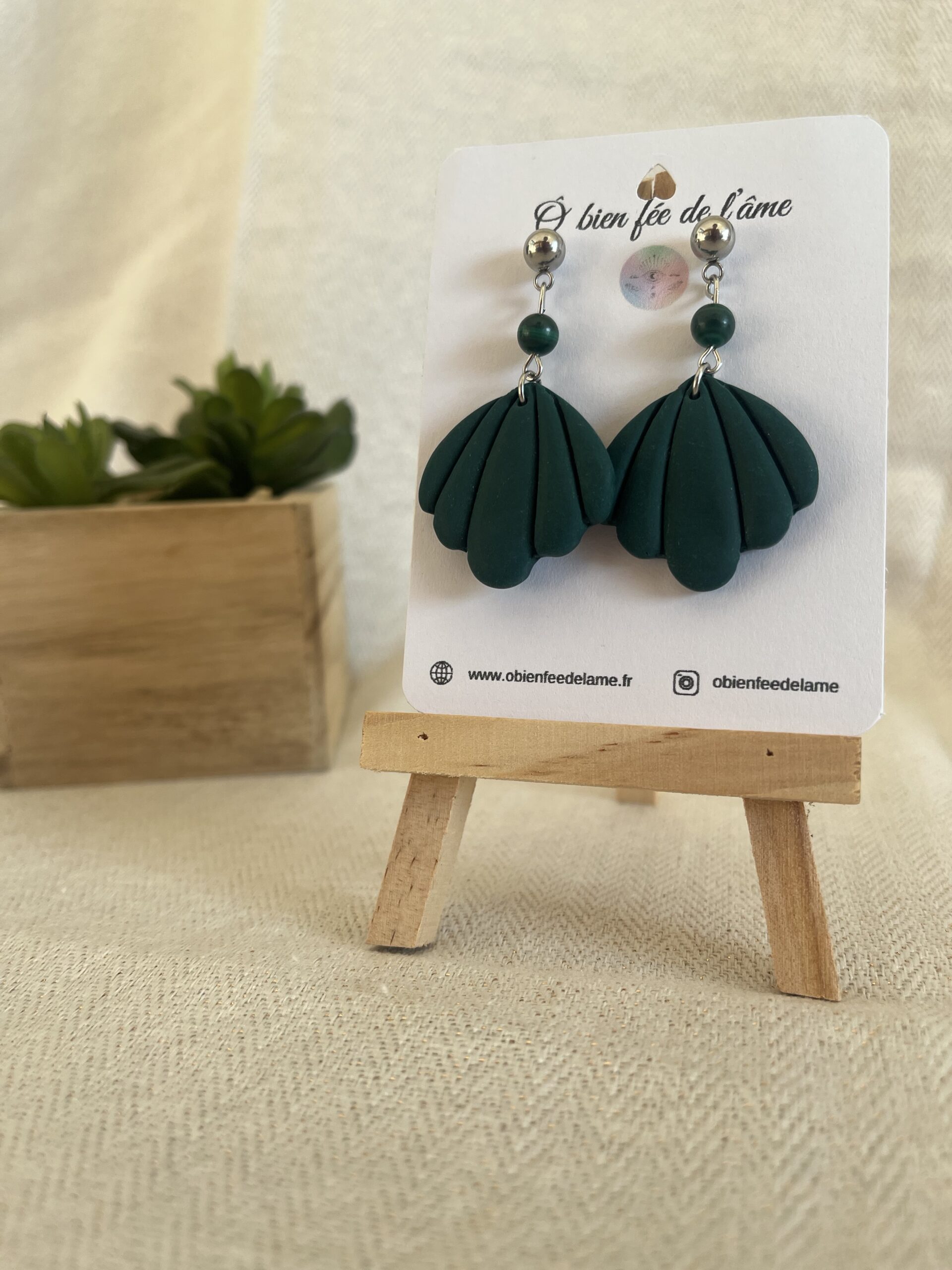 Boucles d’oreilles « Tahys » en argile polymère couleur vert foncé, avec pierre naturelle malachite en 6mm et attache boule en acier inoxydable argenté.