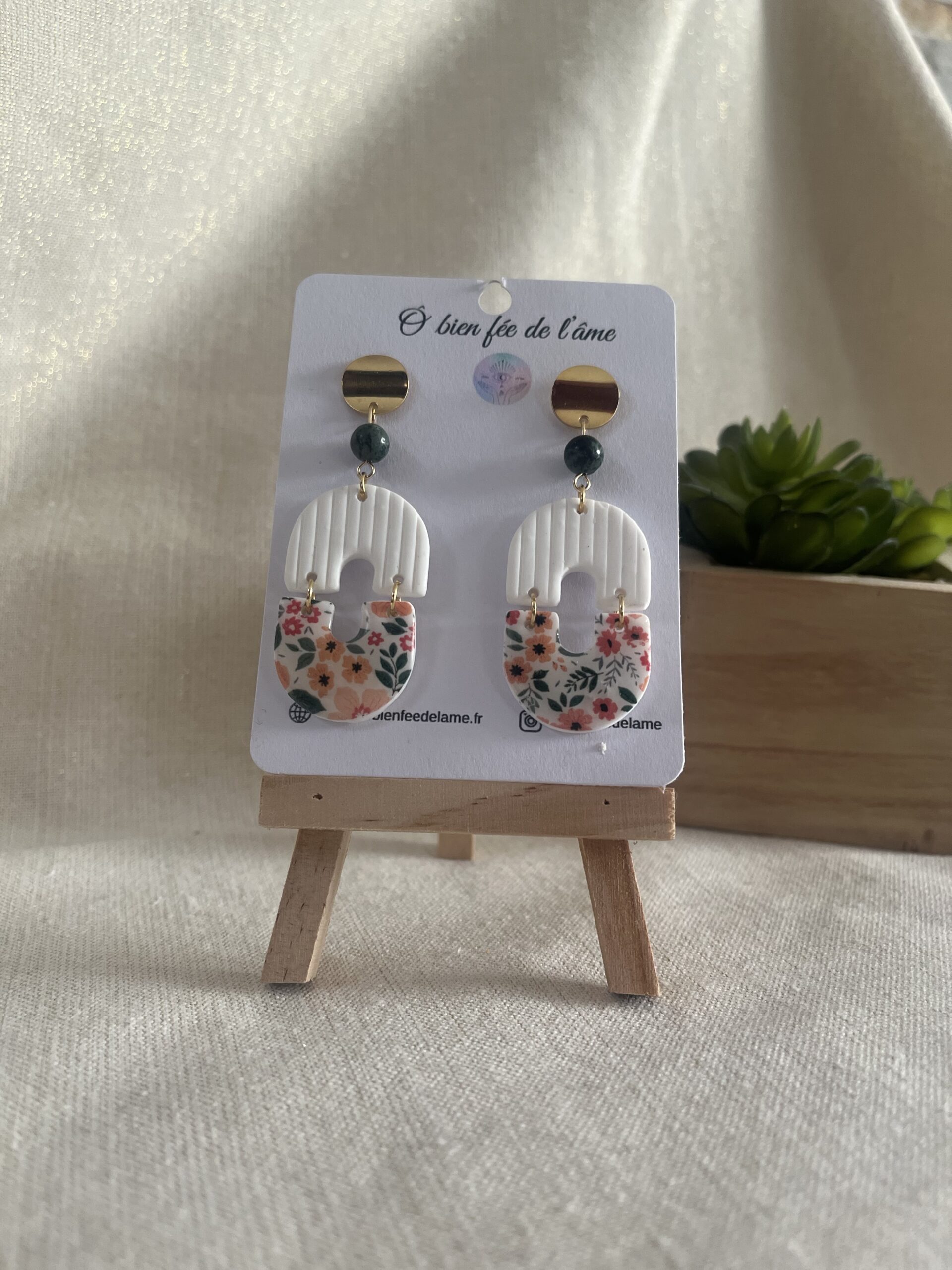 Boucles d’oreilles « Daya » en argile polymère couleur blanche et fleurie, avec pierre naturelle agate mousse en 6mm et attache rond en acier inoxydable doré.