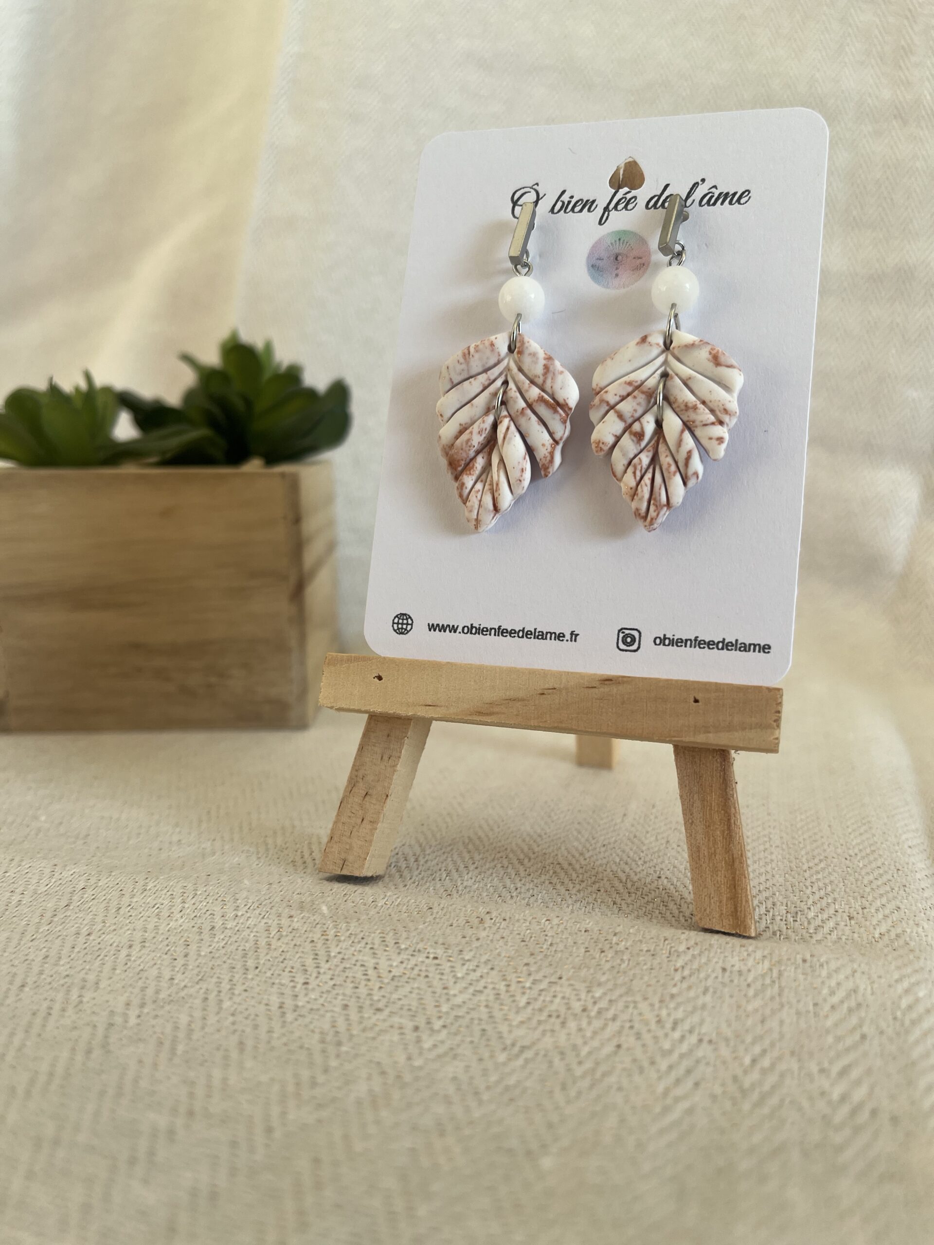 Boucles d’oreilles « Oléa » en argile polymère couleur blanc et rose gold, avec pierre naturelle jade blanc en 6mm et attache tige en acier inoxydable argenté.