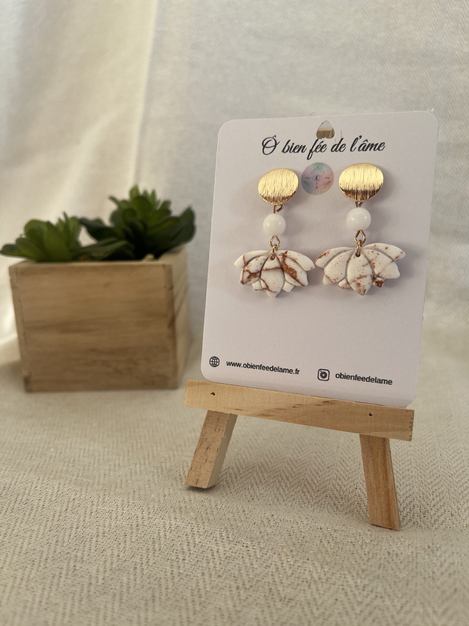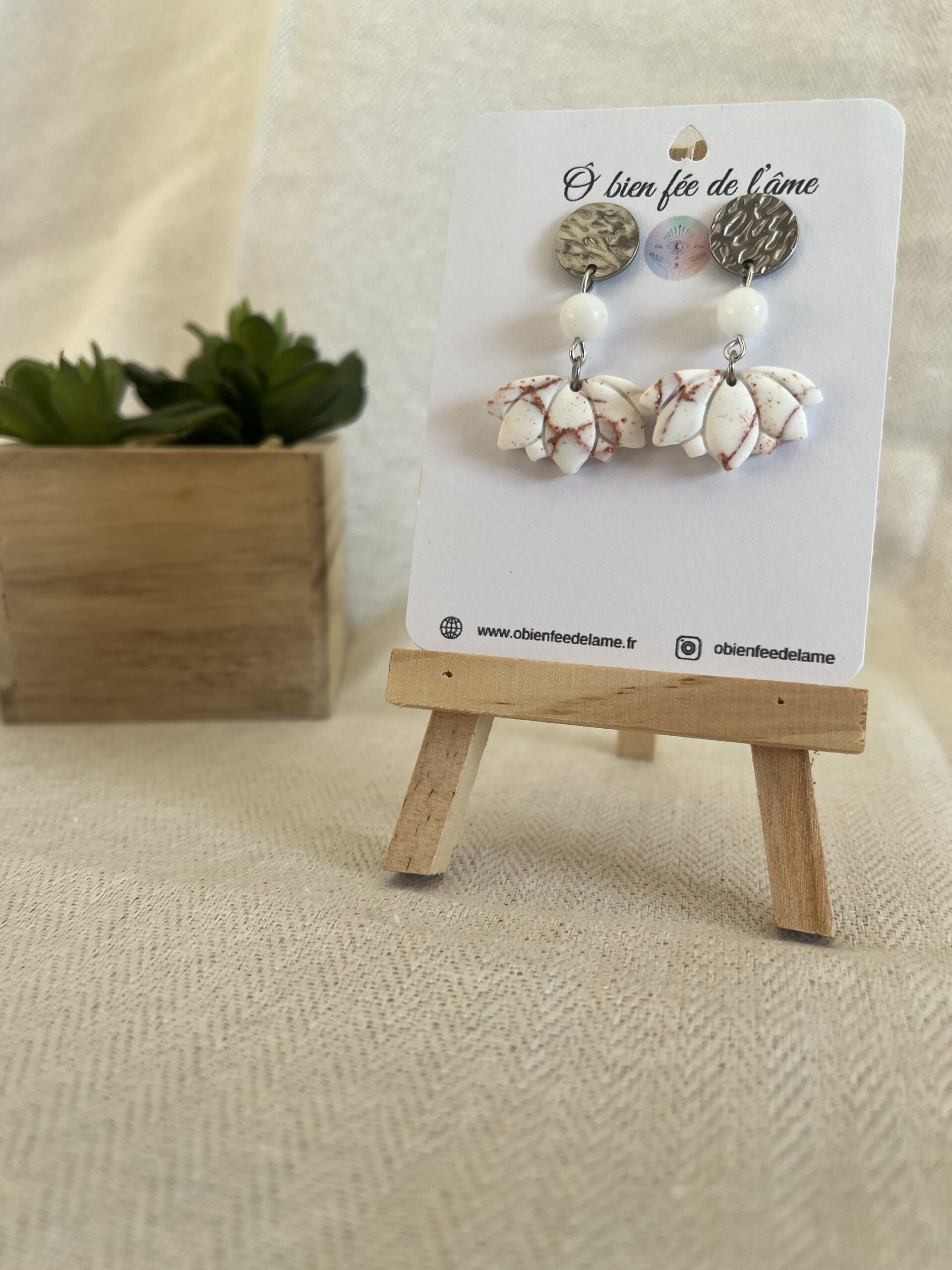Boucles d’oreilles « Hiana » en argile polymère couleur blanche et rose gold, avec pierre naturelle Jade blanc en 6mm et attache ronde en acier inoxydable doré ou argenté.