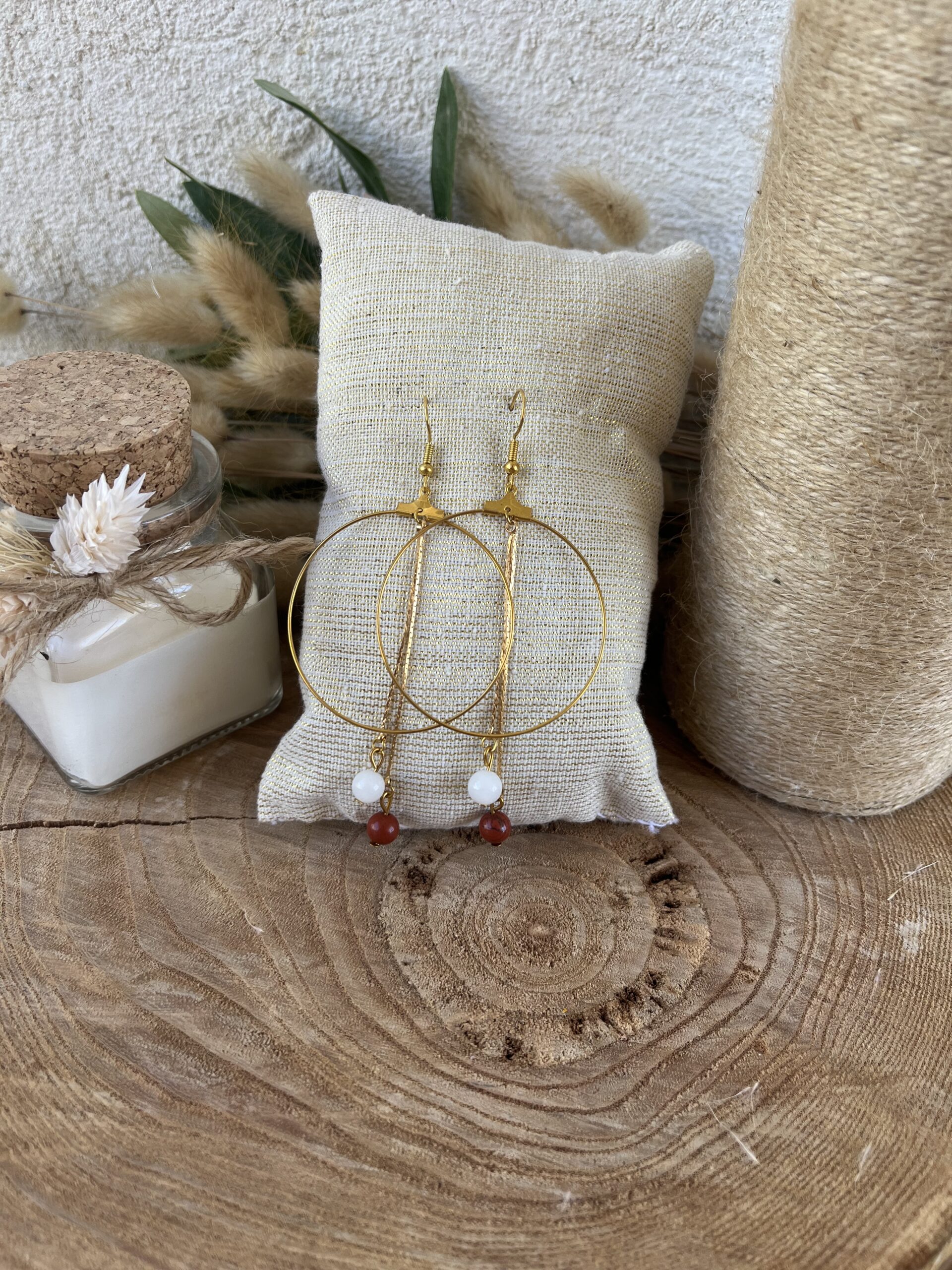 Boucles d’oreilles créoles en Jade Blanc et Jaspe Rouge perles 6mm, en acier inoxydable finition doré.