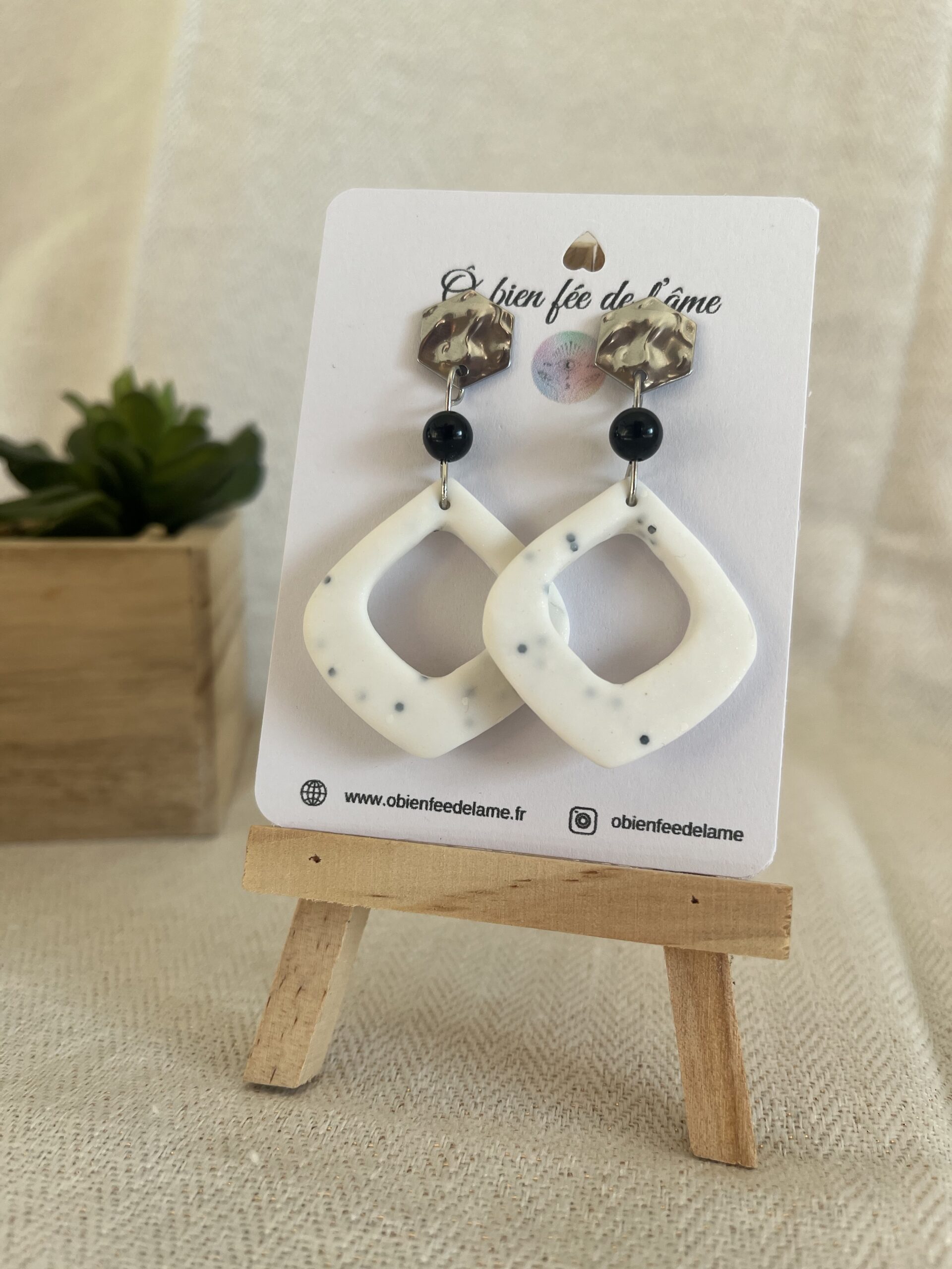 Boucles d’oreilles « Ema » en argile polymère couleur blanc granit, avec pierre naturelle obsidienne en 6mm et attache hexagone en acier inoxydable argenté.