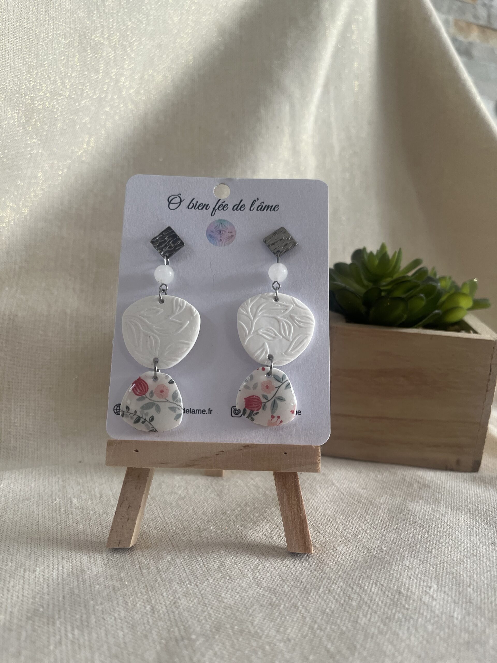 Boucles d’oreilles « Macéo » en argile polymère couleur blanche et fleurie, avec pierre naturelle jade blanc en 6mm et attache losange en acier inoxydable argenté.