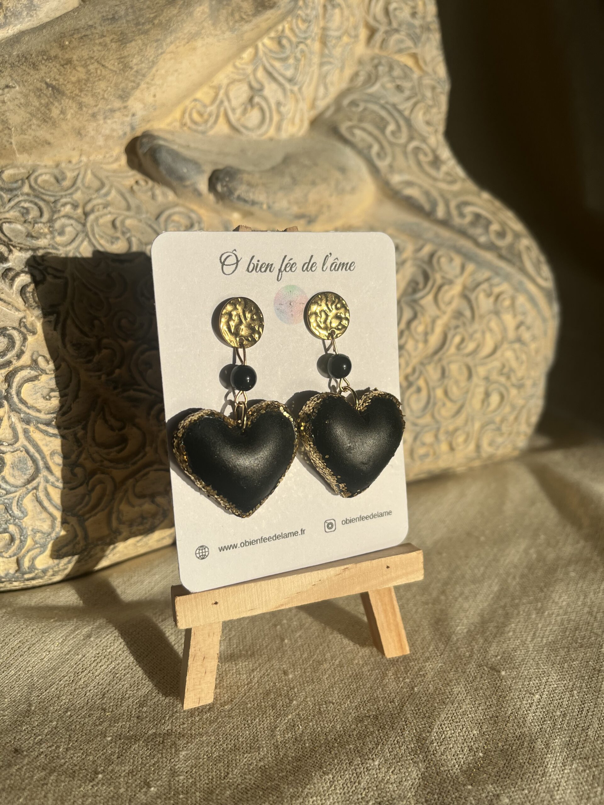 Boucles d’oreilles « Maeko » cœur relief en argile polymère couleur noir et paillettes or, avec pierre naturelle obsidienne en 6mm et attache rond en acier inoxydable doré.