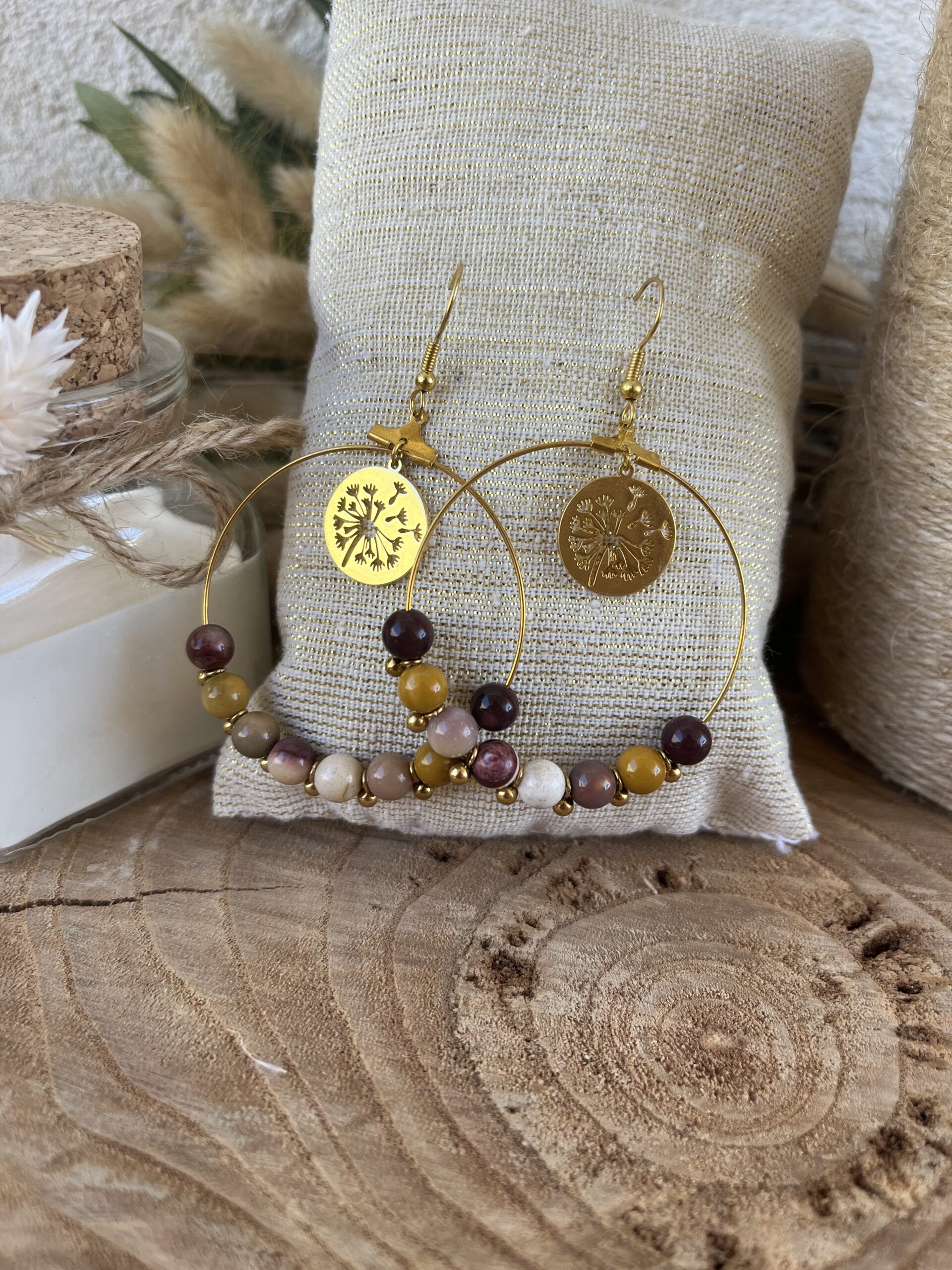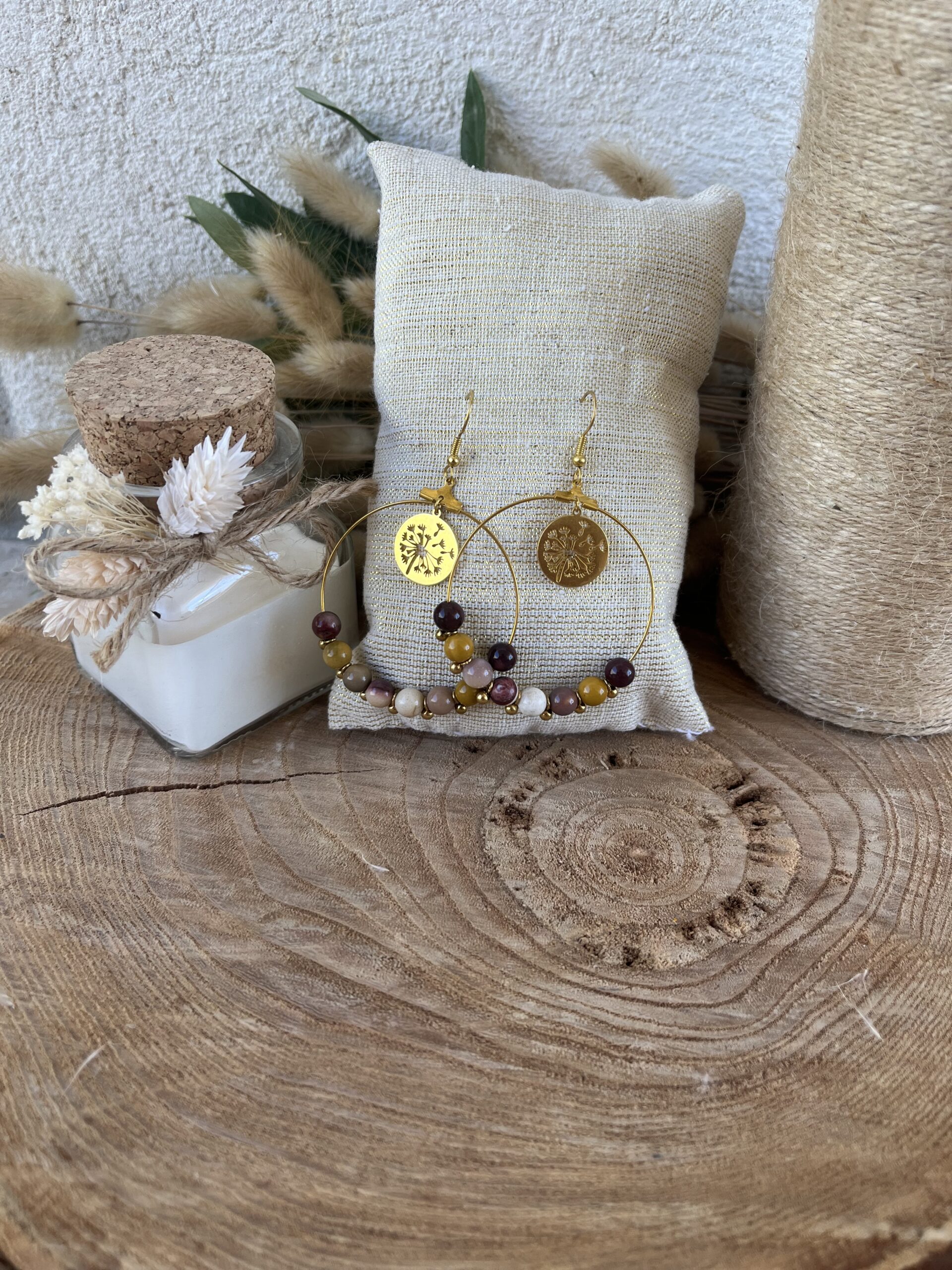 Boucles d’oreilles créoles en Mokaïte en perle de 6mm avec breloques en acier inoxydable finition doré.