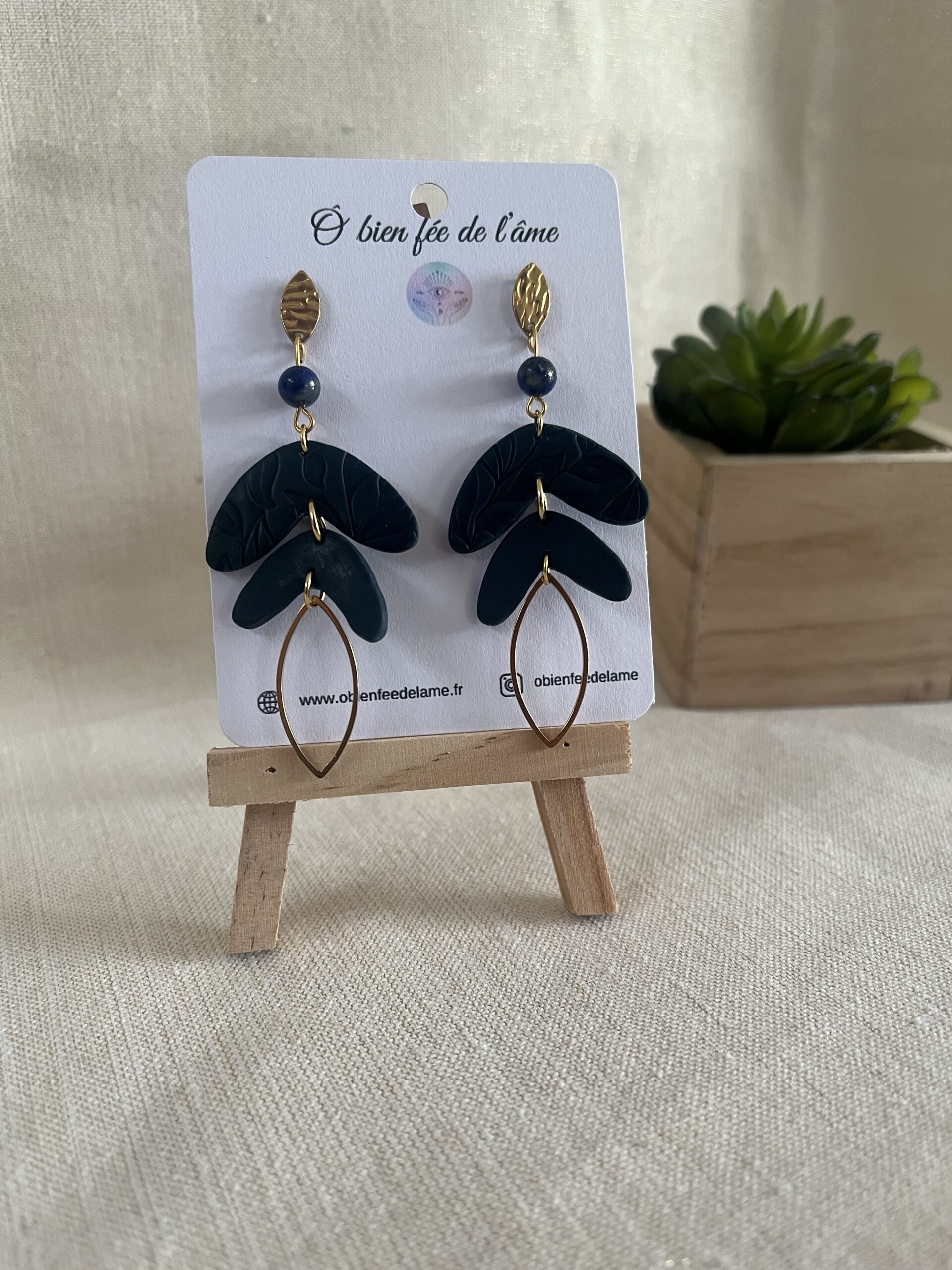 Boucles d’oreilles « Myla » en argile polymère couleur bleu nuit,  avec pierre naturelle lapis lazuli en 6mm et attache et breloque en forme de feuille en acier inoxydable doré.