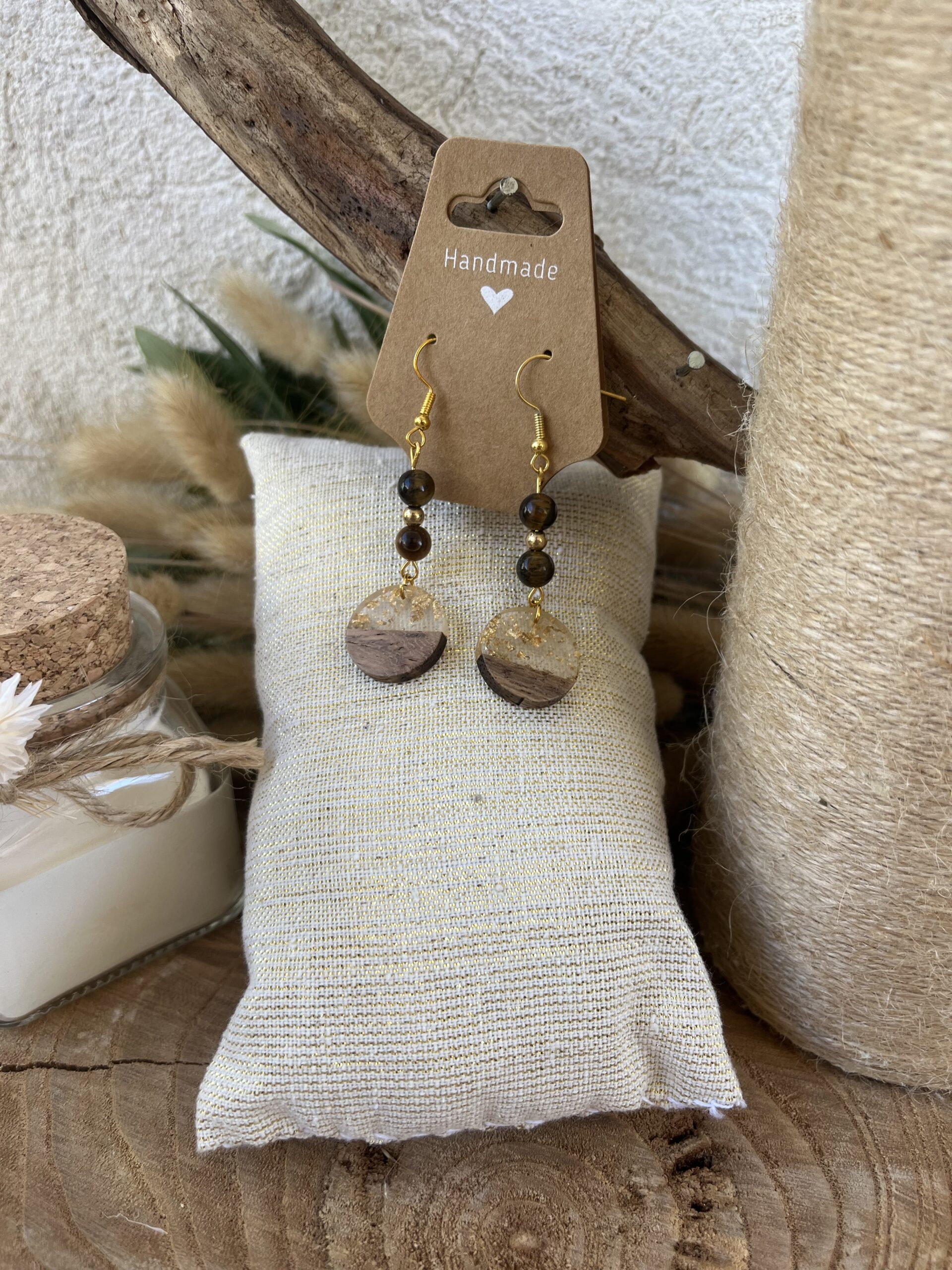 Boucles d’oreilles pendantes en Œil de Tigre perles 6mm avec breloque imitation bois et acier inoxydable finition doré.