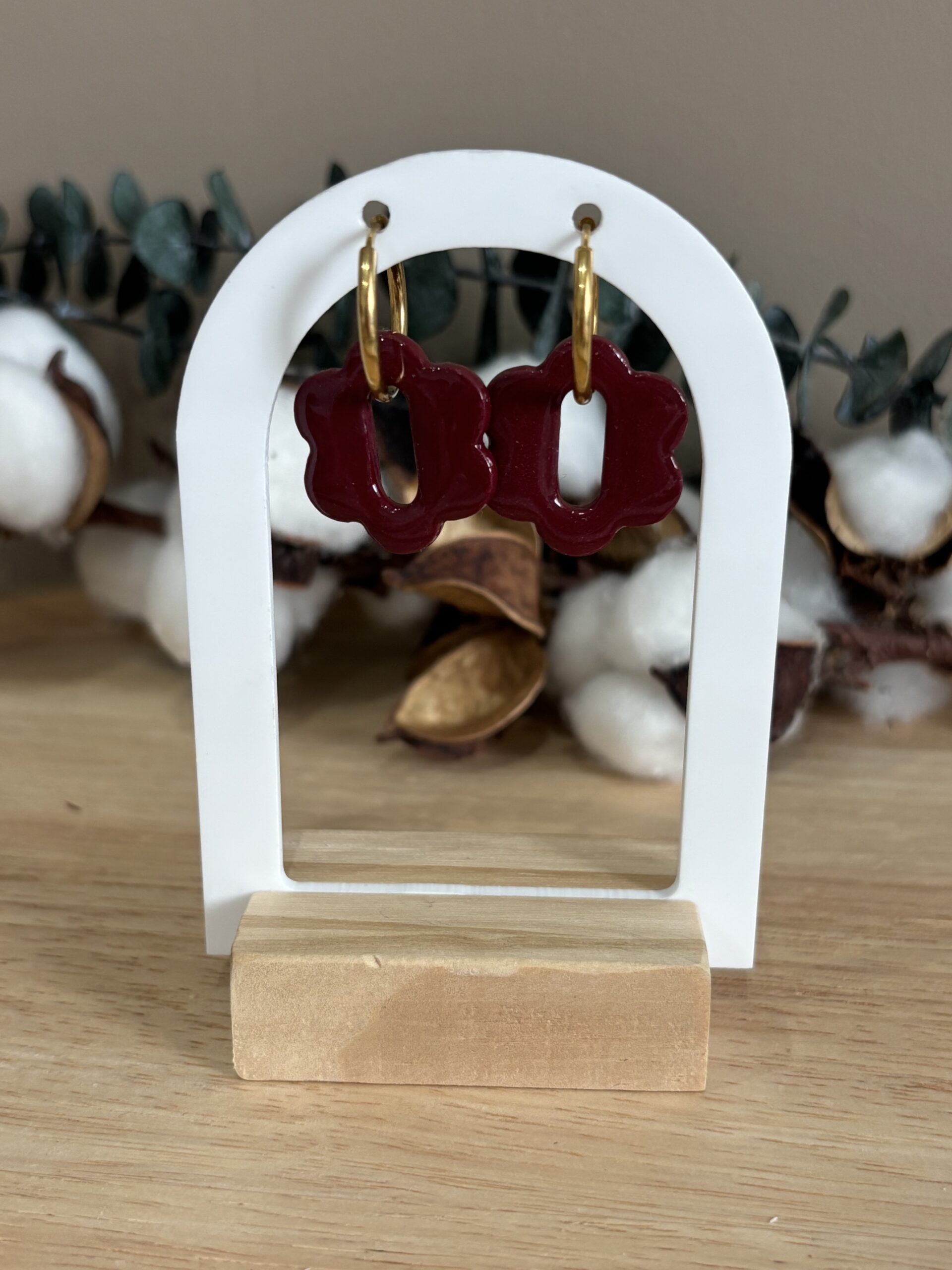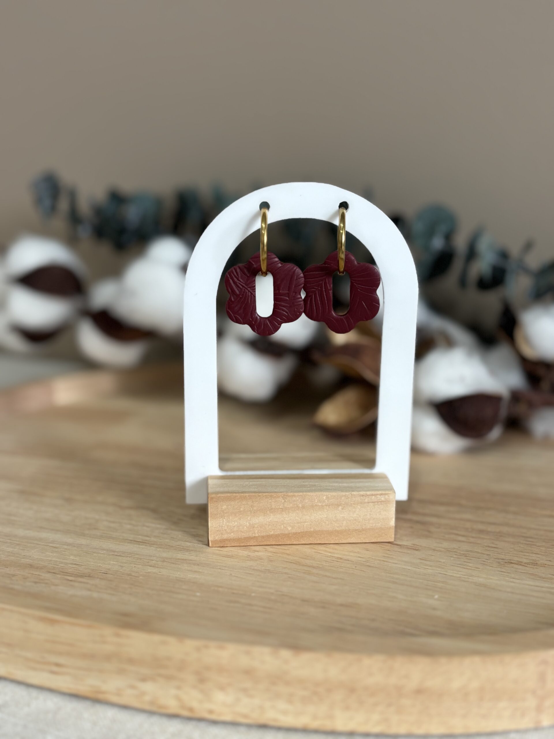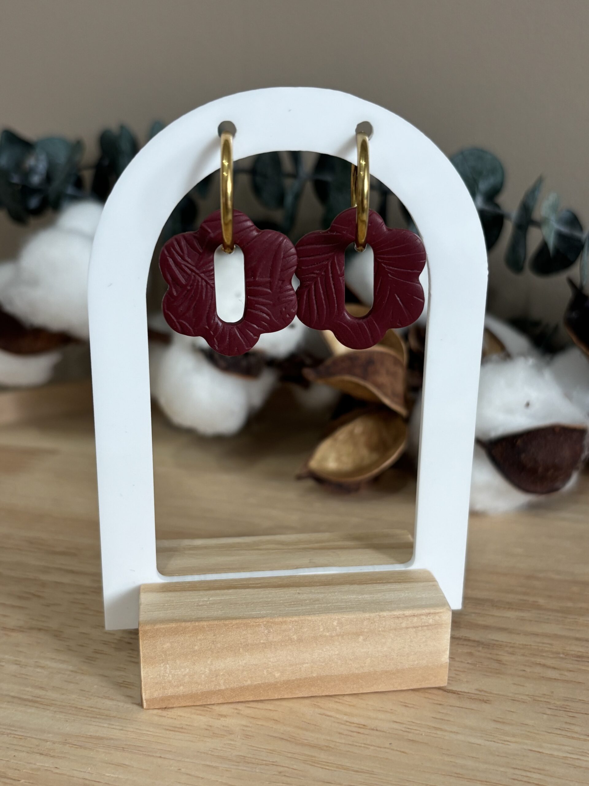 Apportez une touche d’éclat et de fantaisie à vos tenues avec nos boucles d’oreilles pampilles Anaya bordeaux en forme de fleur avec un côté en relief mat et un côté en résine.