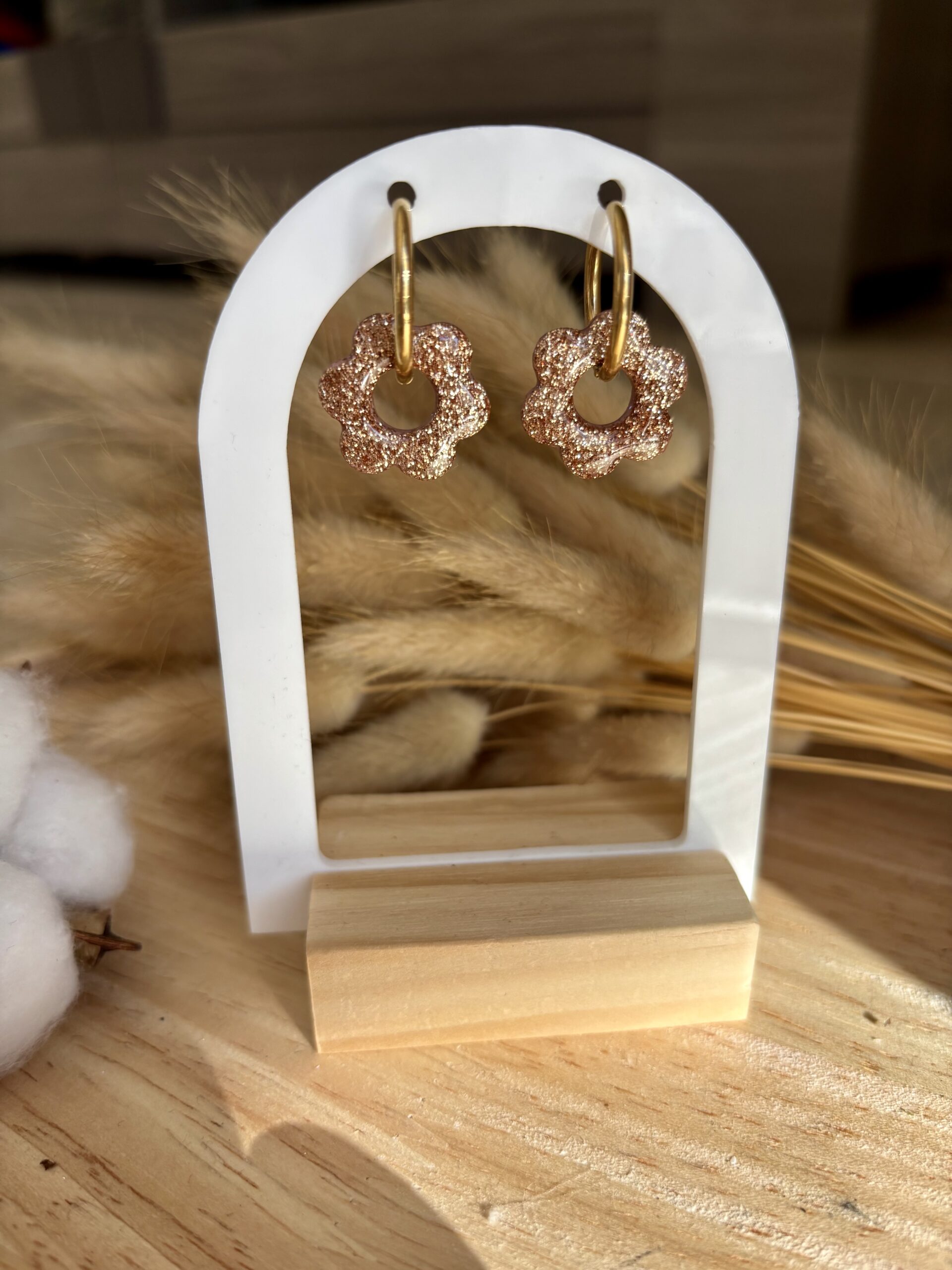 Apportez une touche d’éclat et de fantaisie à vos tenues avec nos boucles d’oreilles pampilles fleur réversible un côté à paillettes et un côté en résine .