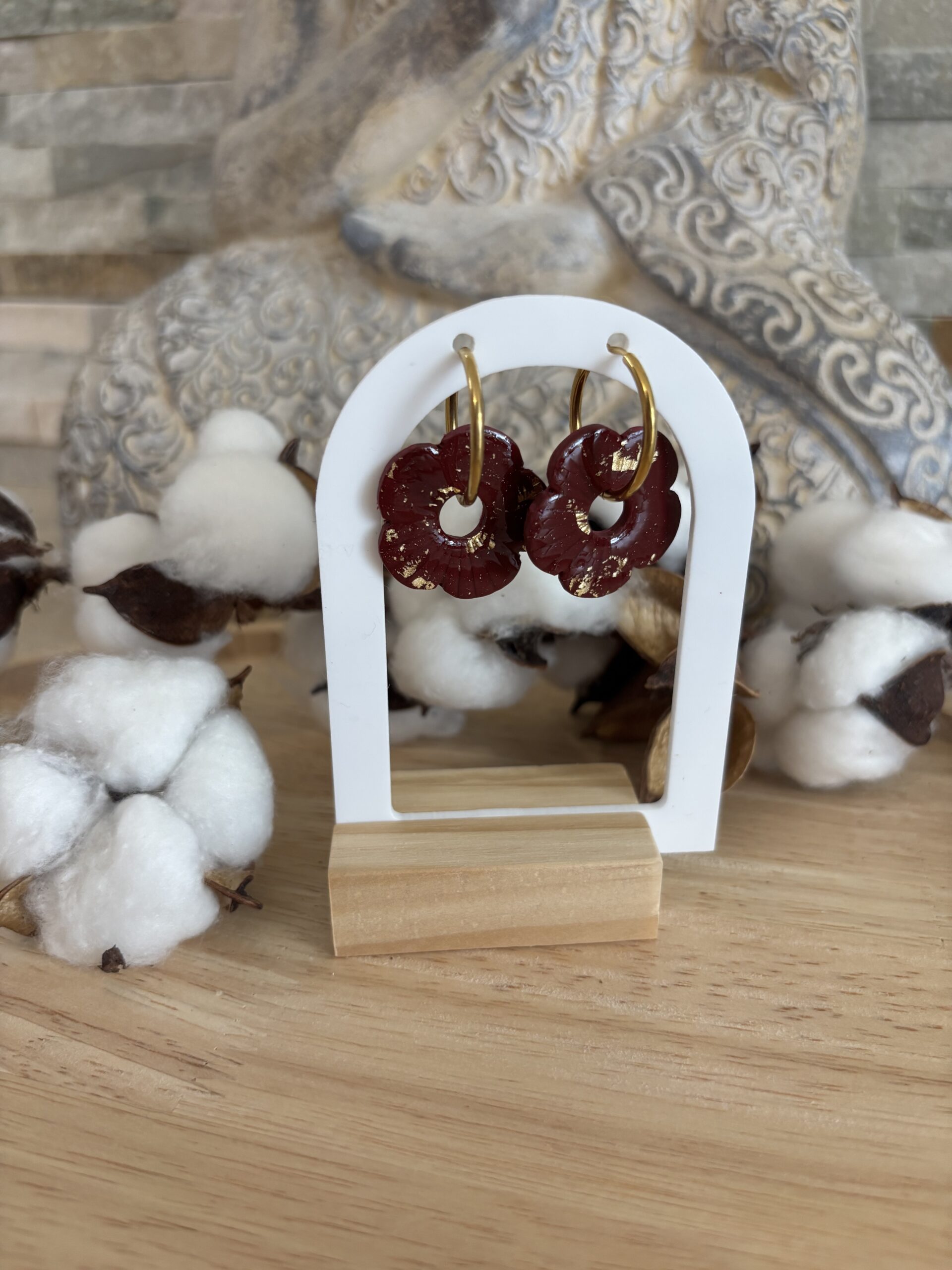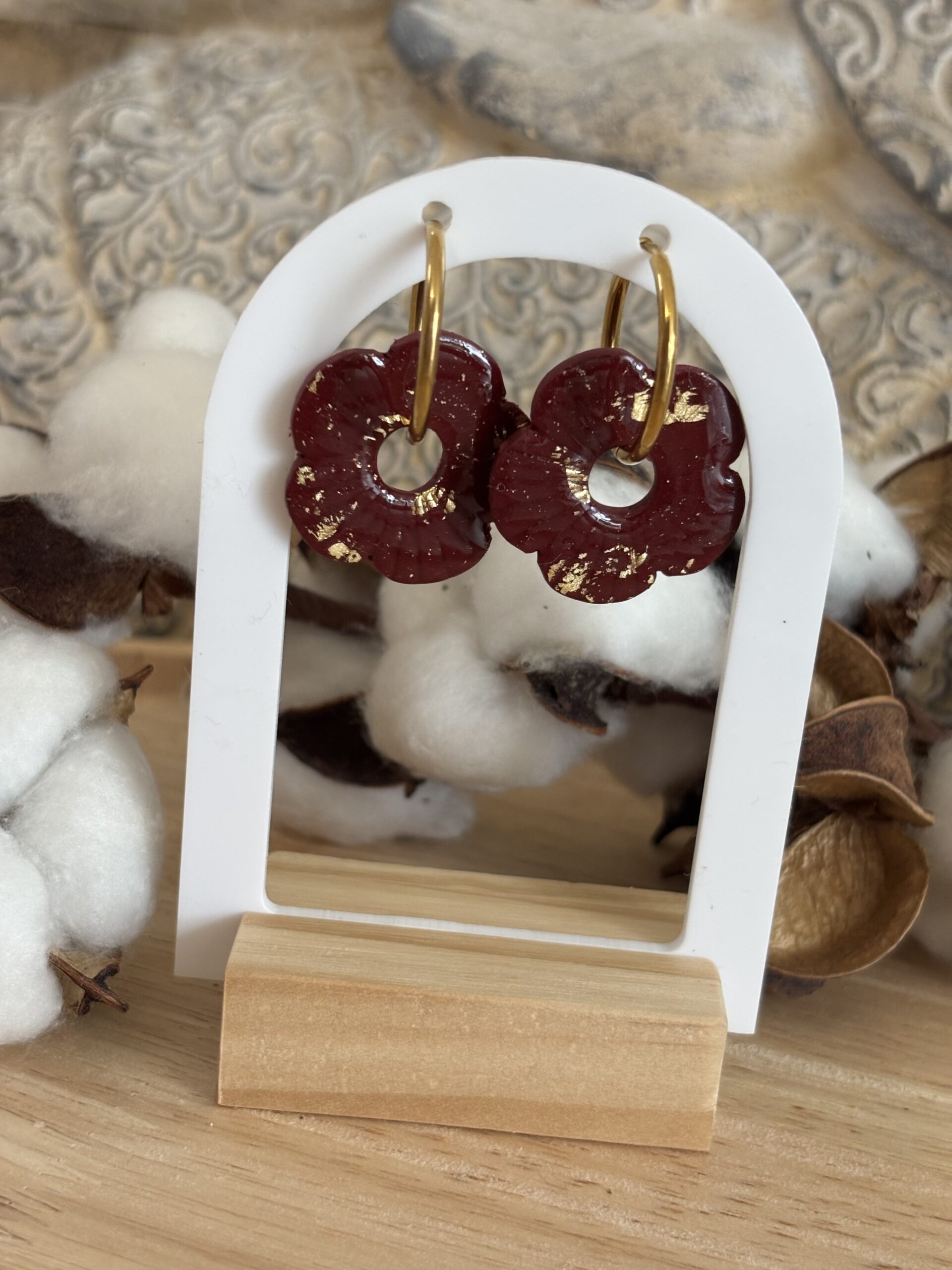 Apportez une touche d’éclat et de fantaisie à vos tenues avec nos boucles d’oreilles pampilles grande fleur bordeaux et doré.