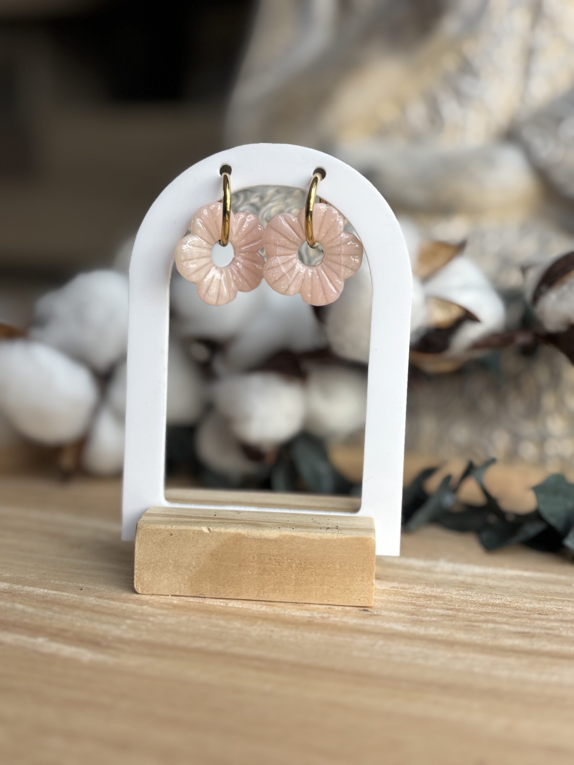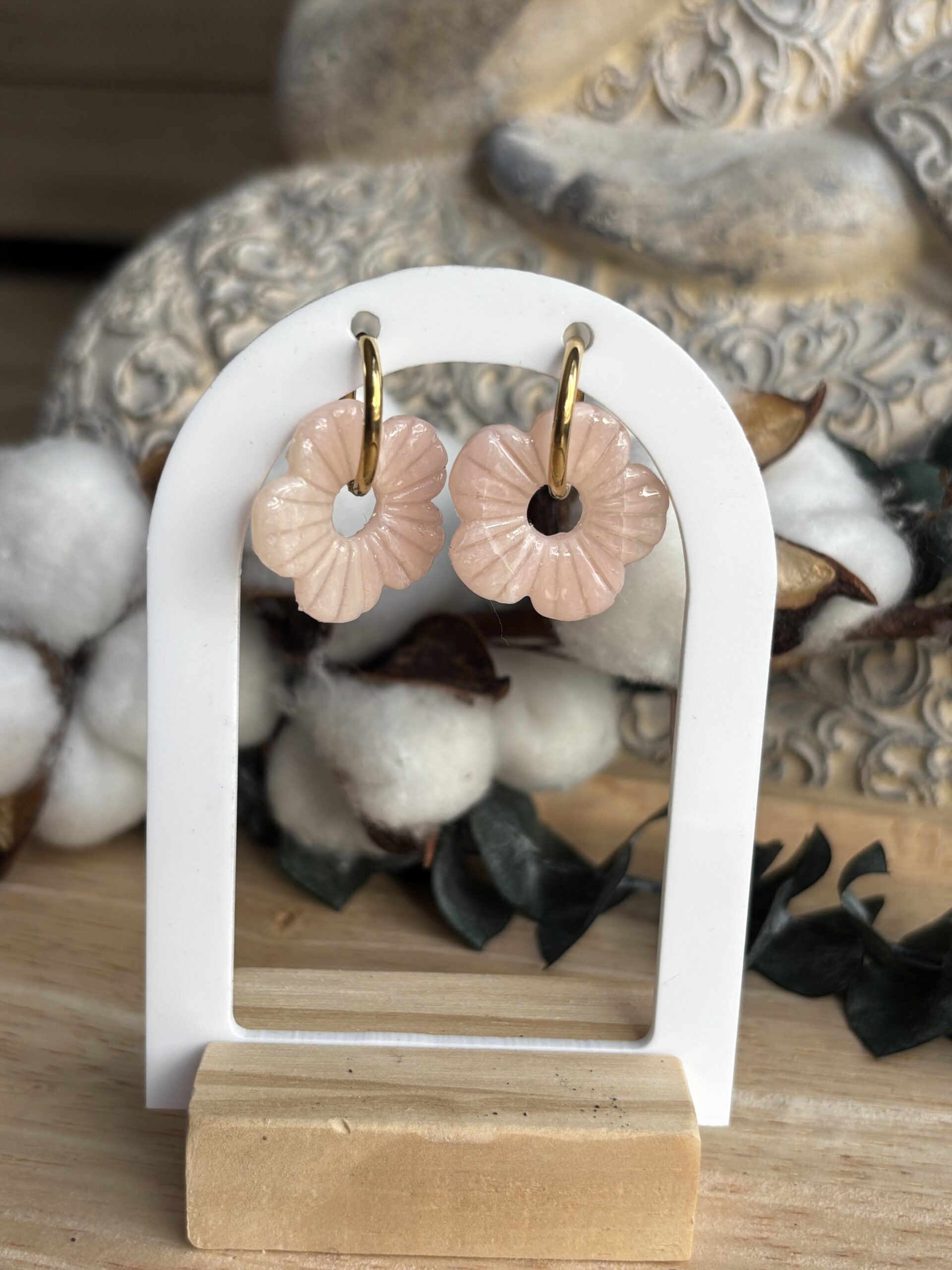 Apportez une touche d’éclat et de fantaisie à vos tenues avec nos boucles d’oreilles pampilles fleur 25 mm imitation quartz rose.