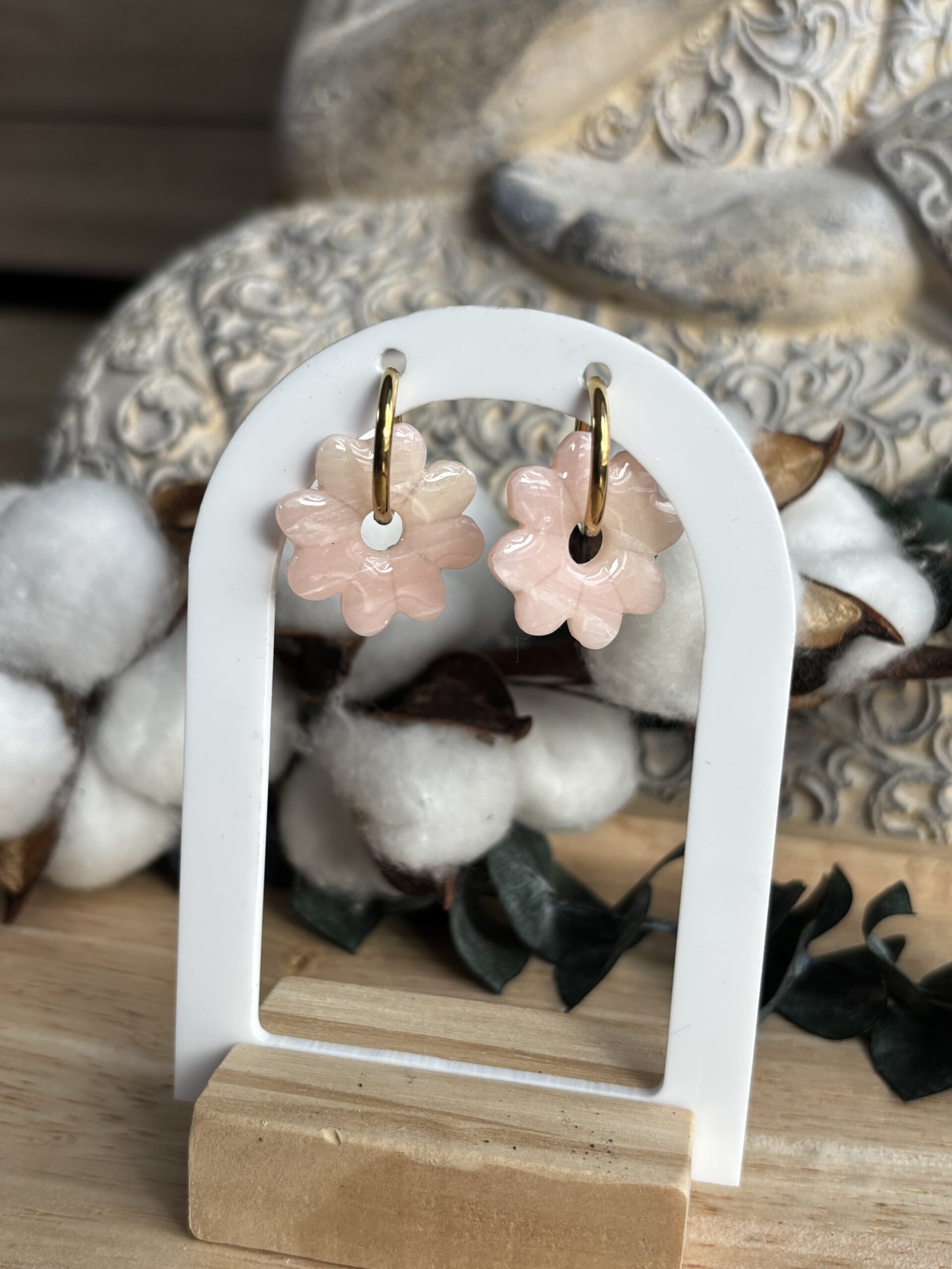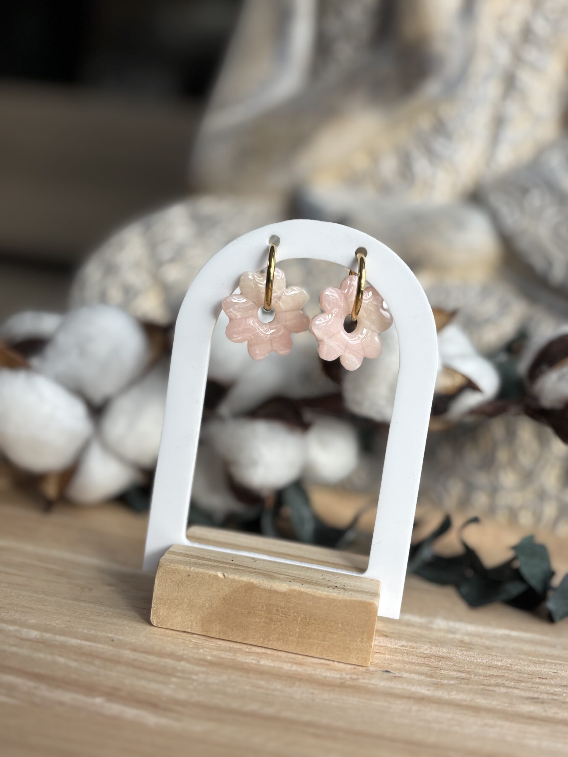 Apportez une touche d’éclat et de fantaisie à vos tenues avec nos boucles d’oreilles pampilles fleur imitation quartz rose.