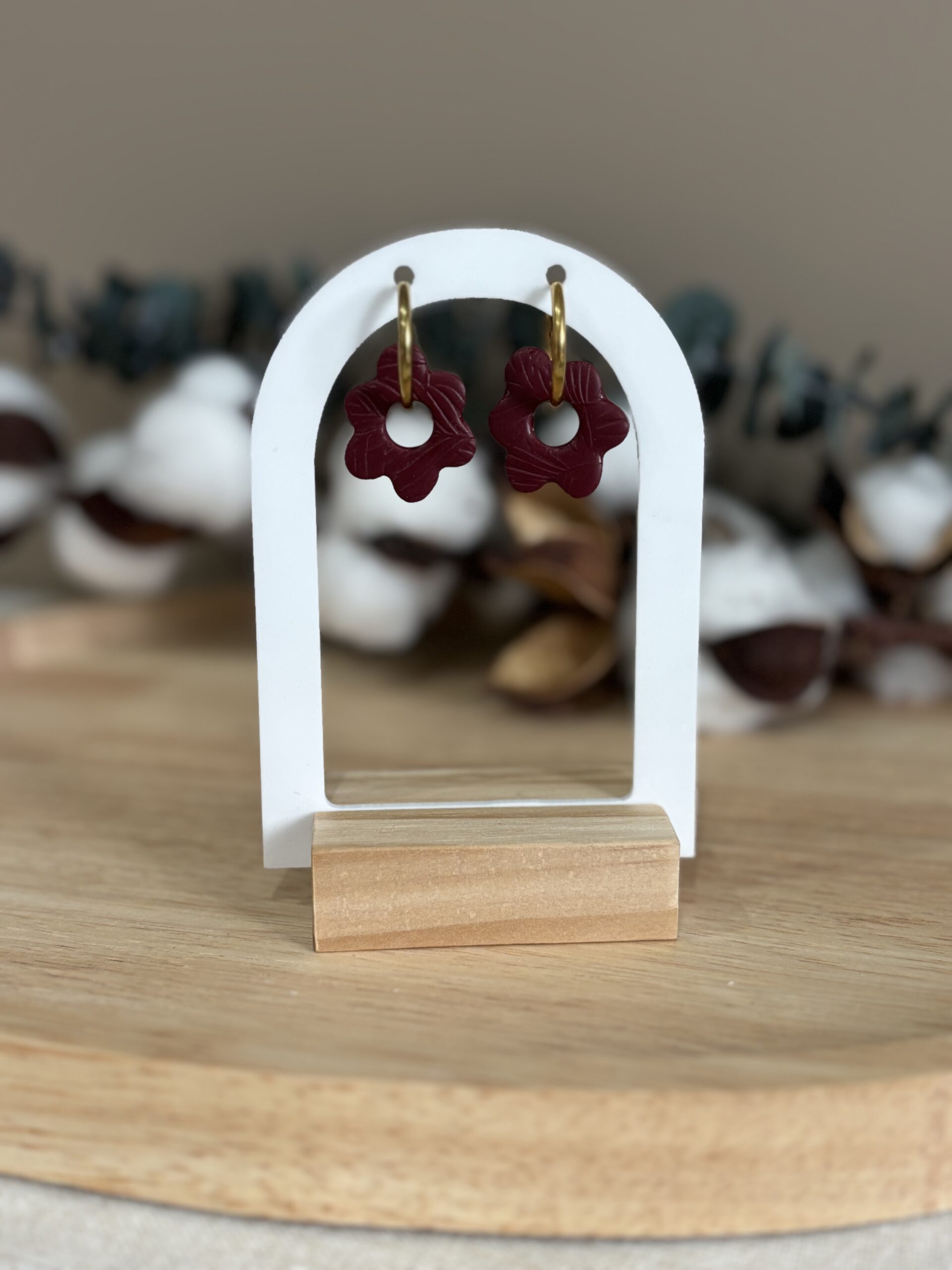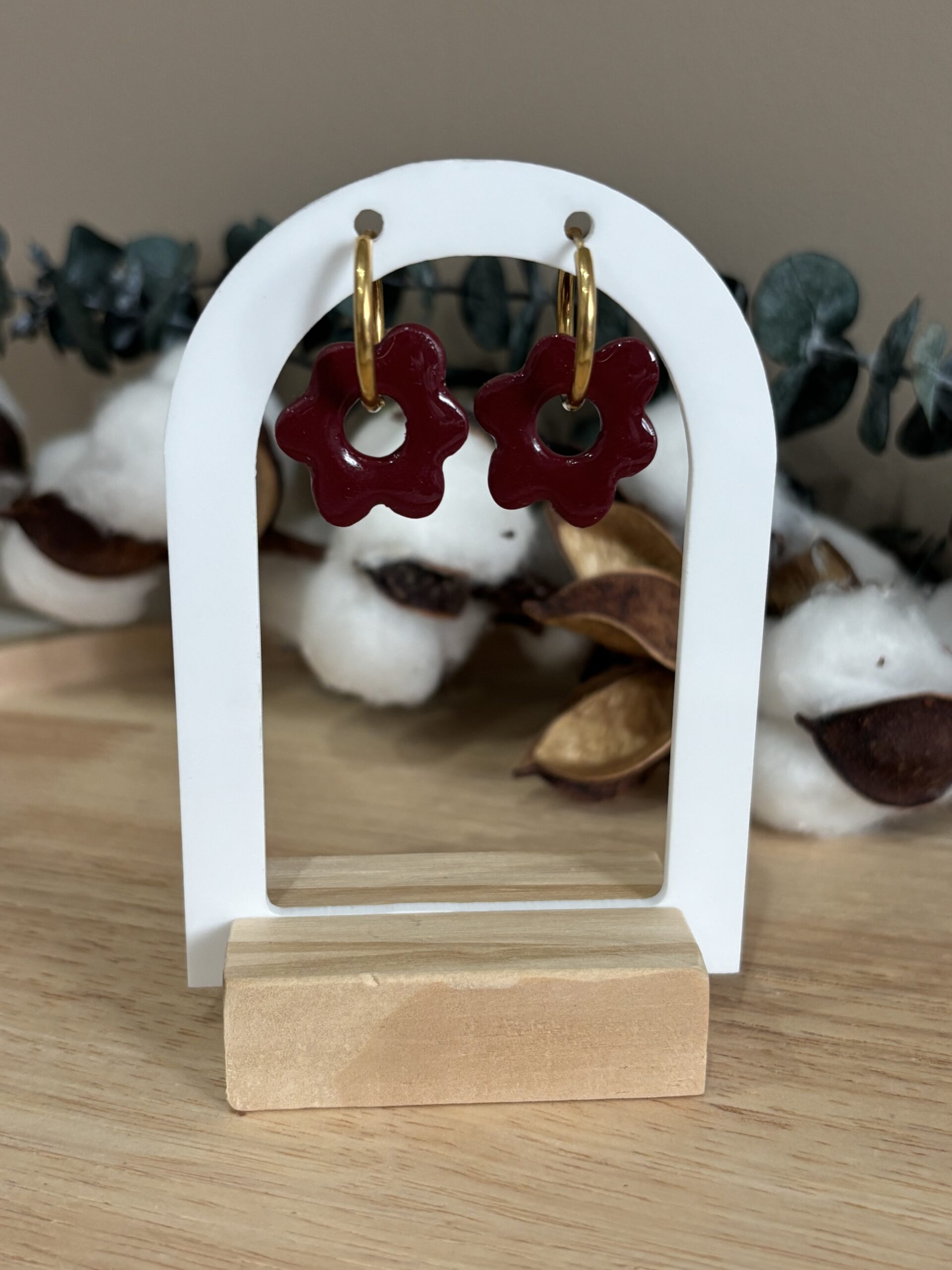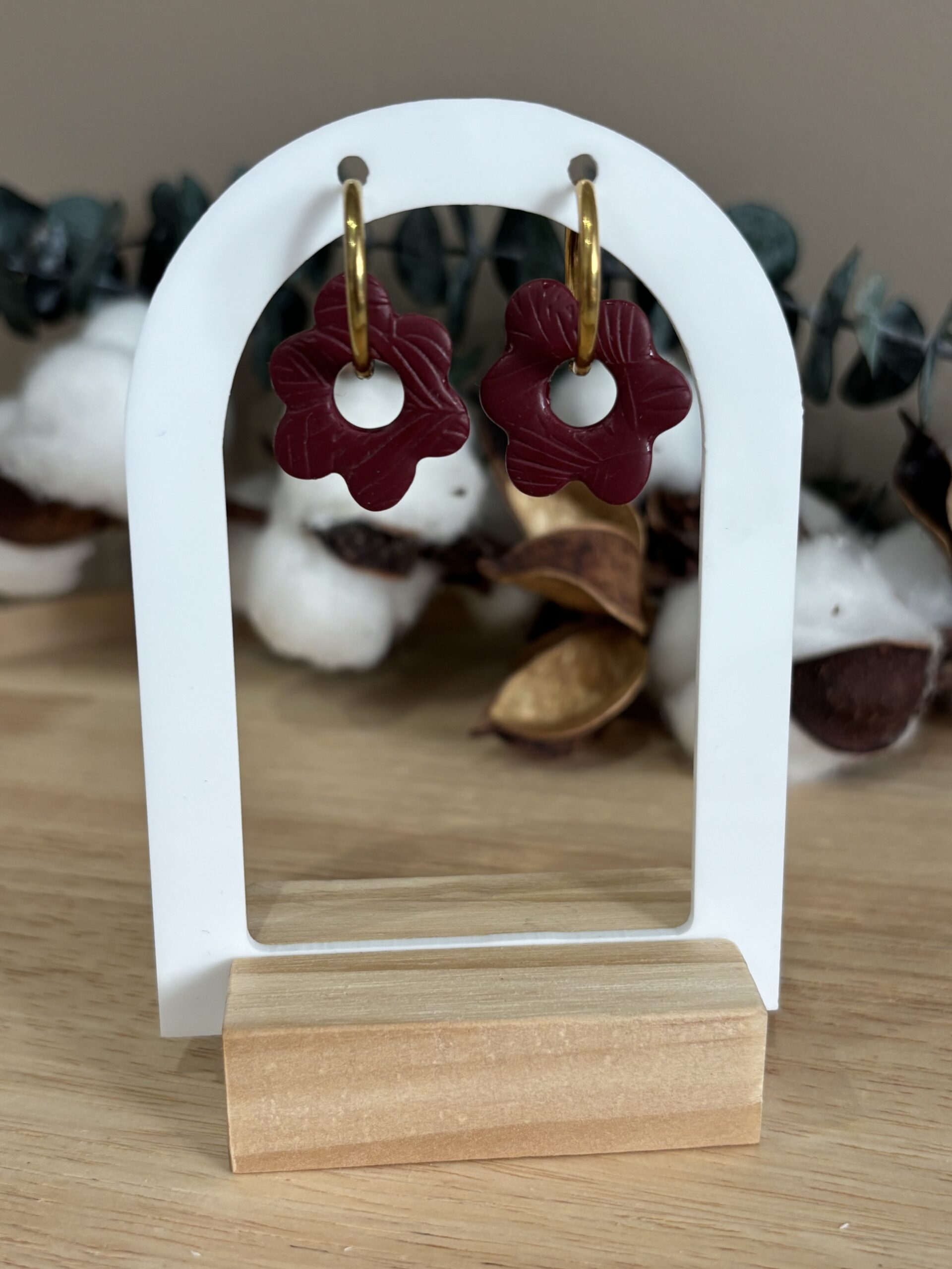 Apportez une touche d’éclat et de fantaisie à vos tenues avec nos boucles d’oreilles pampilles Isya en forme de fleur bordeaux avec un côté en relief mat et un côté en résine.