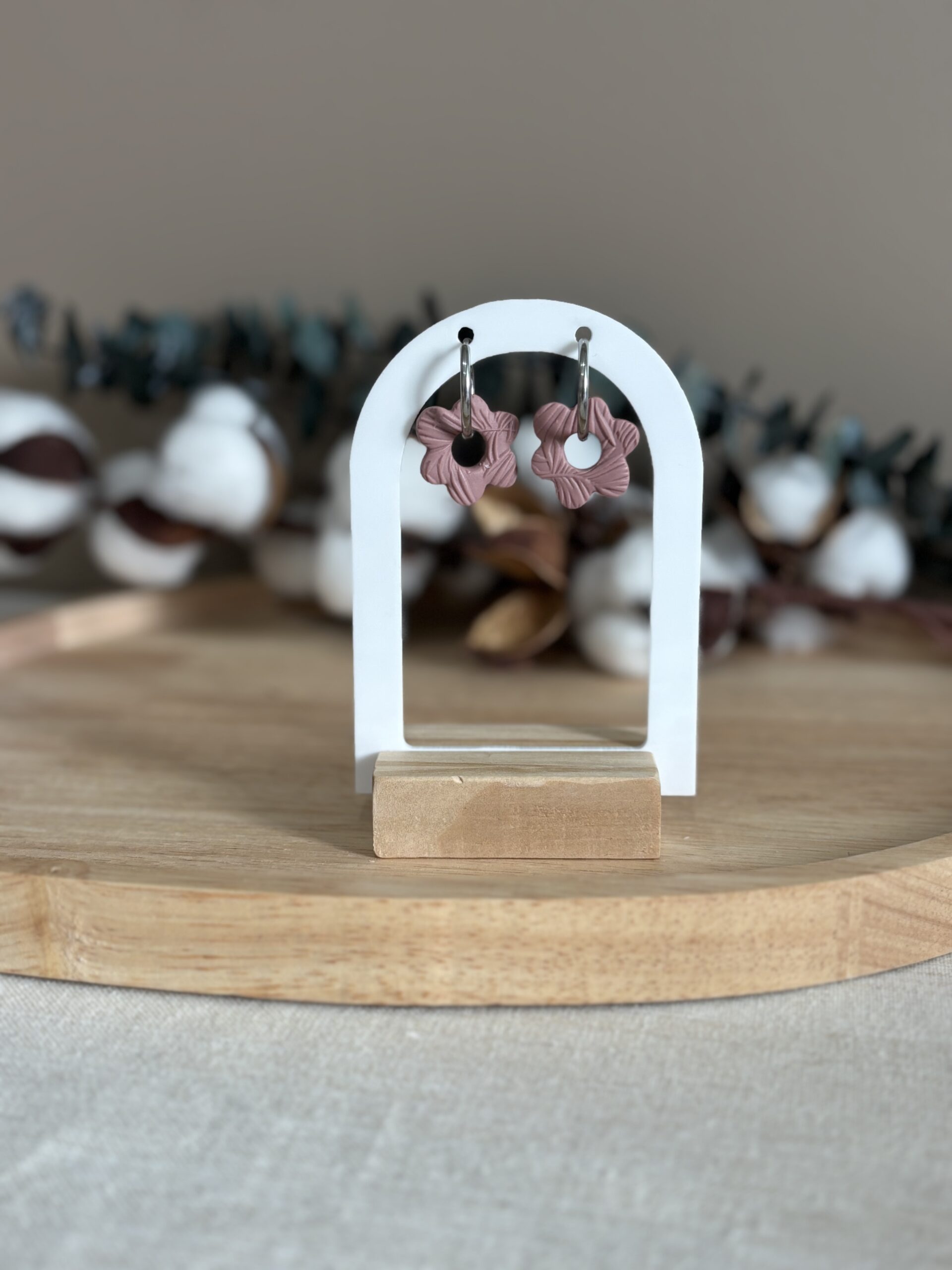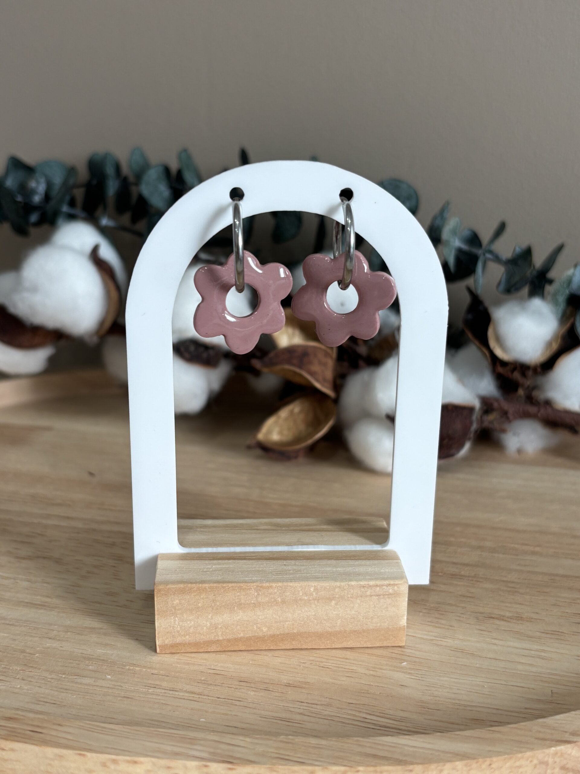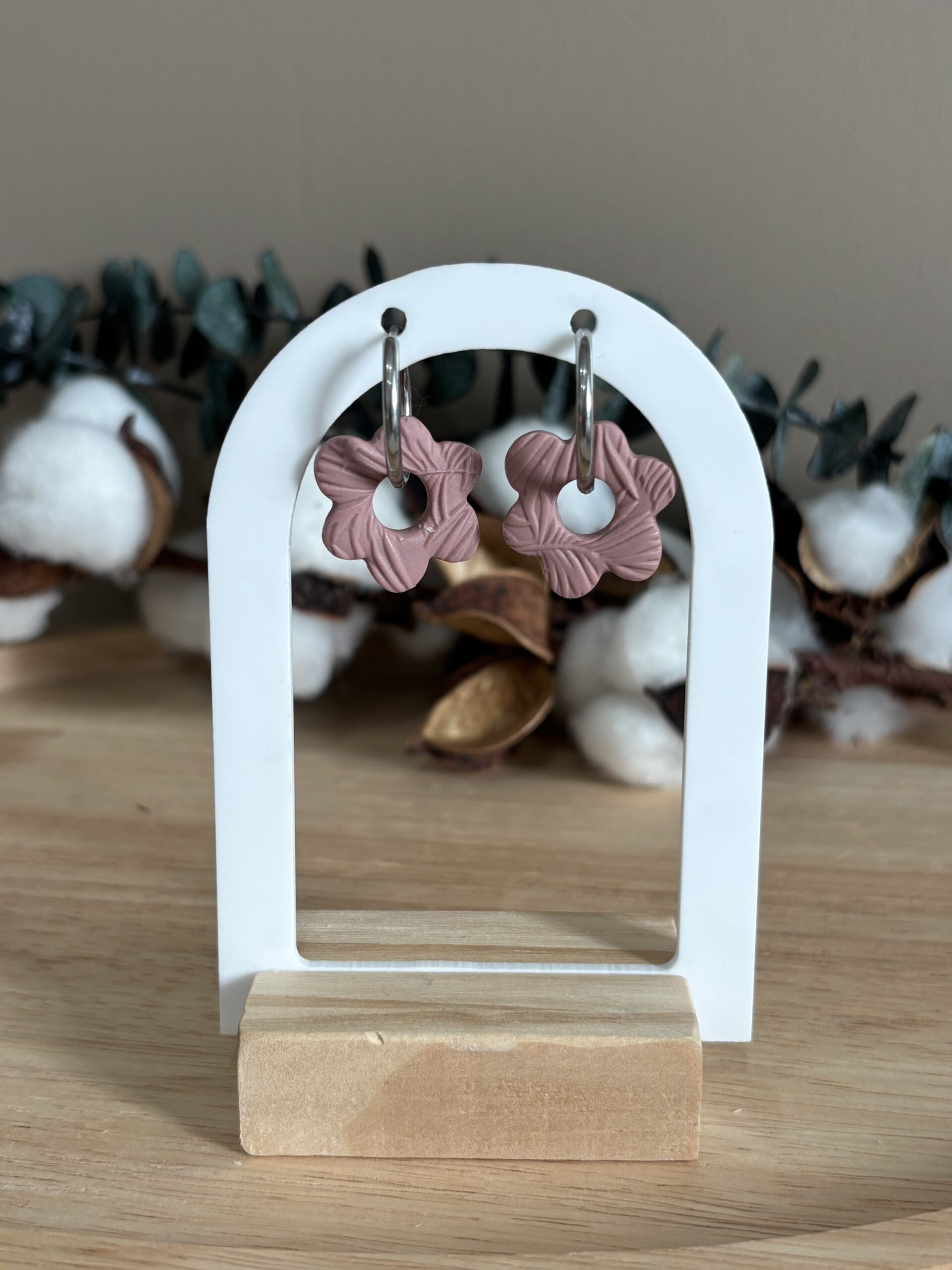 Apportez une touche d’éclat et de fantaisie à vos tenues avec nos boucles d’oreilles pampilles Isya en forme de fleur vieux rose avec un côté en relief mat et un côté en résine.