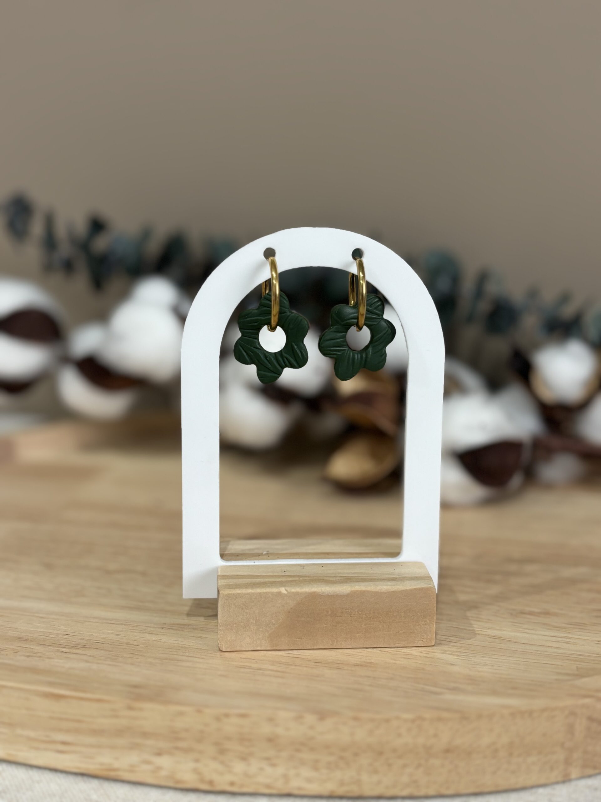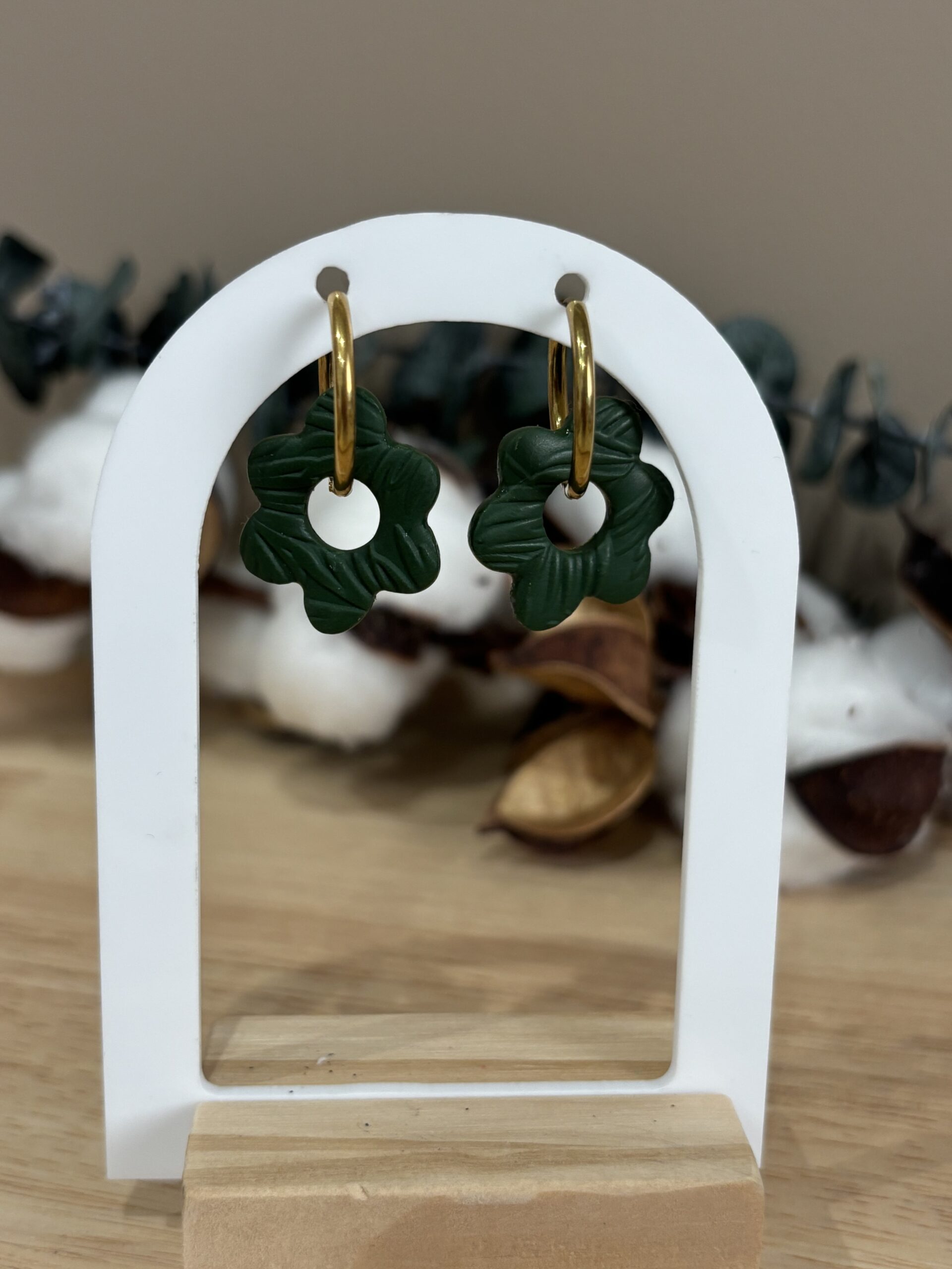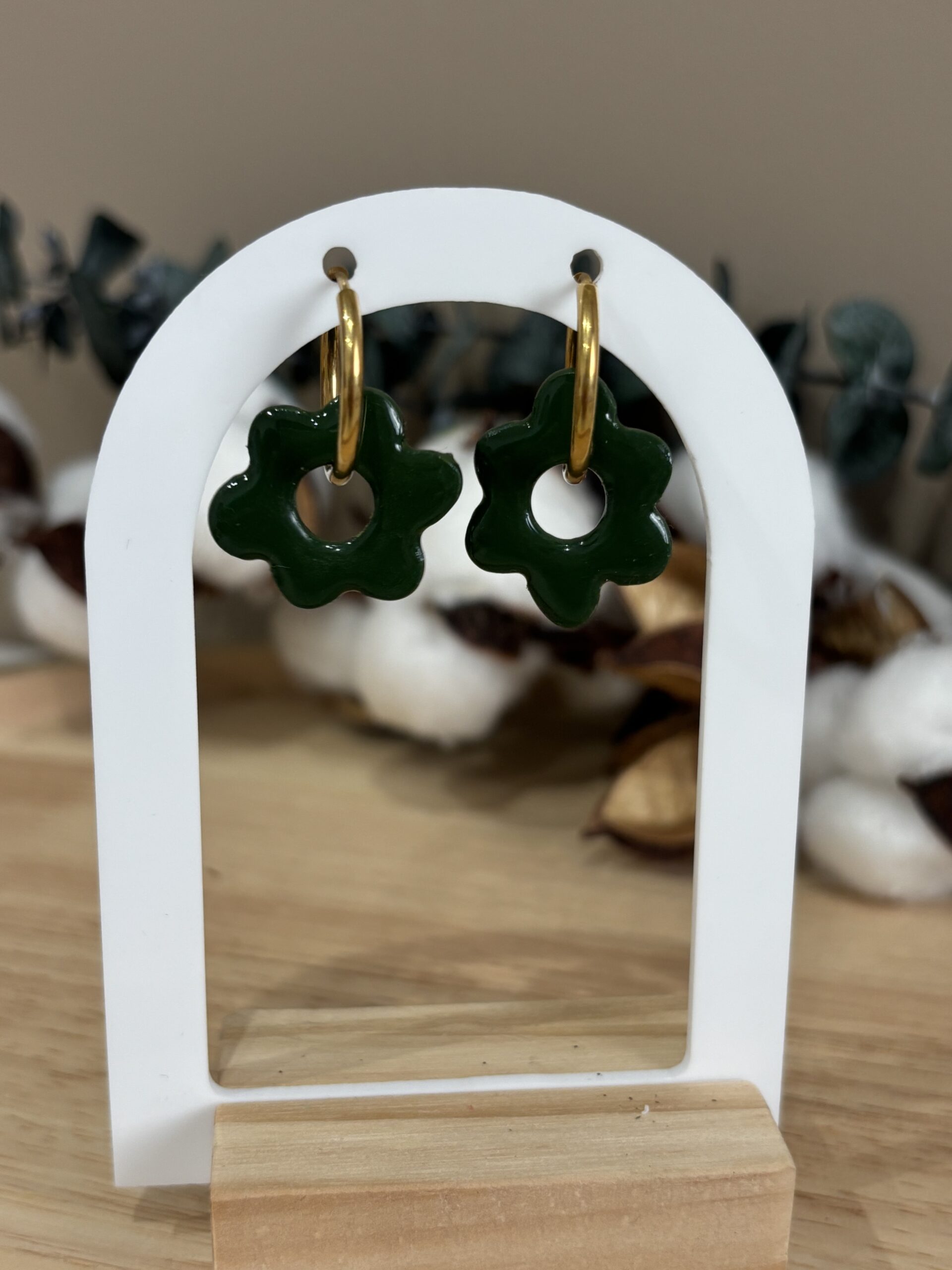 Apportez une touche d’éclat et de fantaisie à vos tenues avec nos boucles d’oreilles pampilles Isya en forme de fleur vert foncé avec un côté en relief mat et un côté en résine.