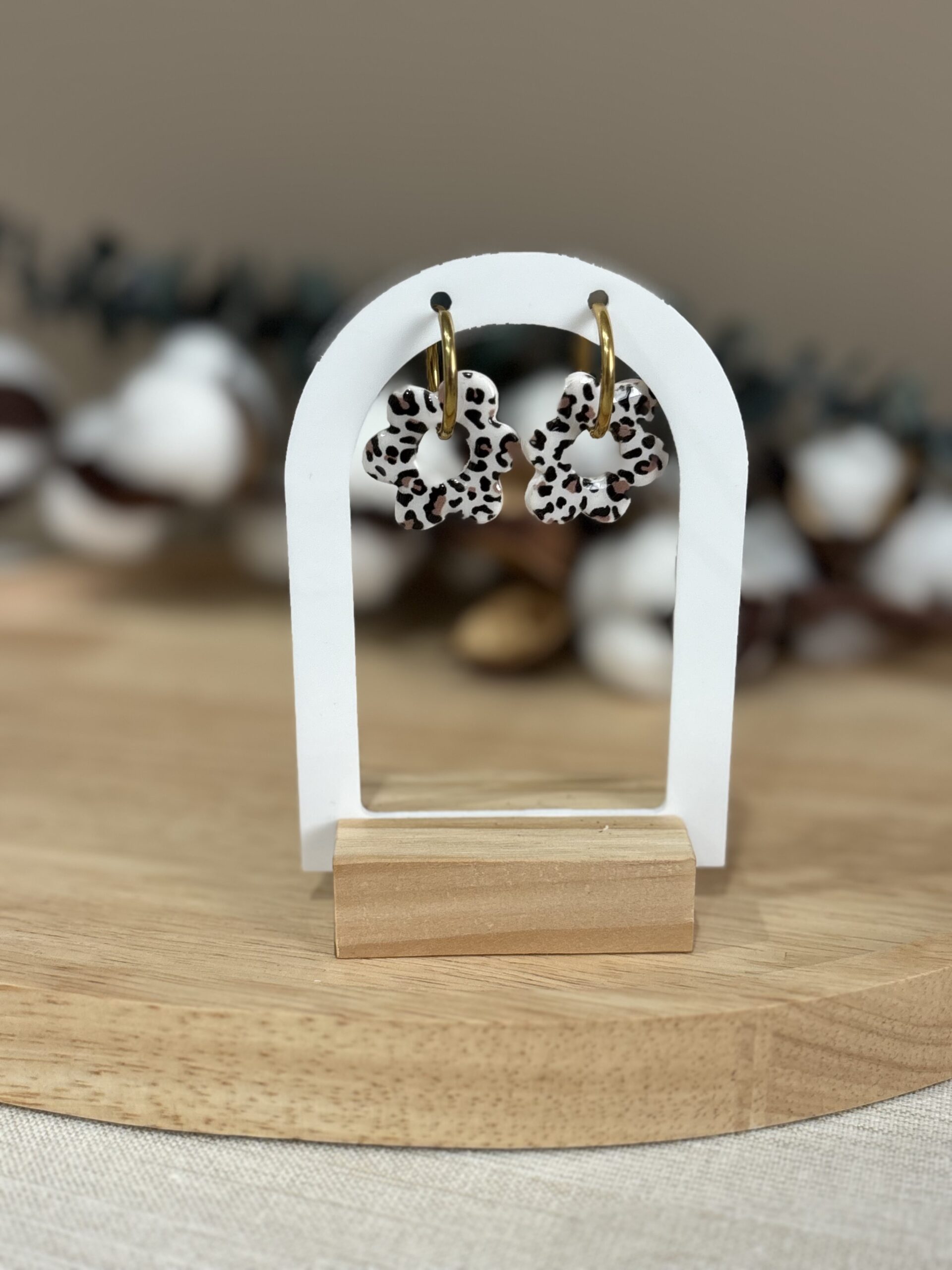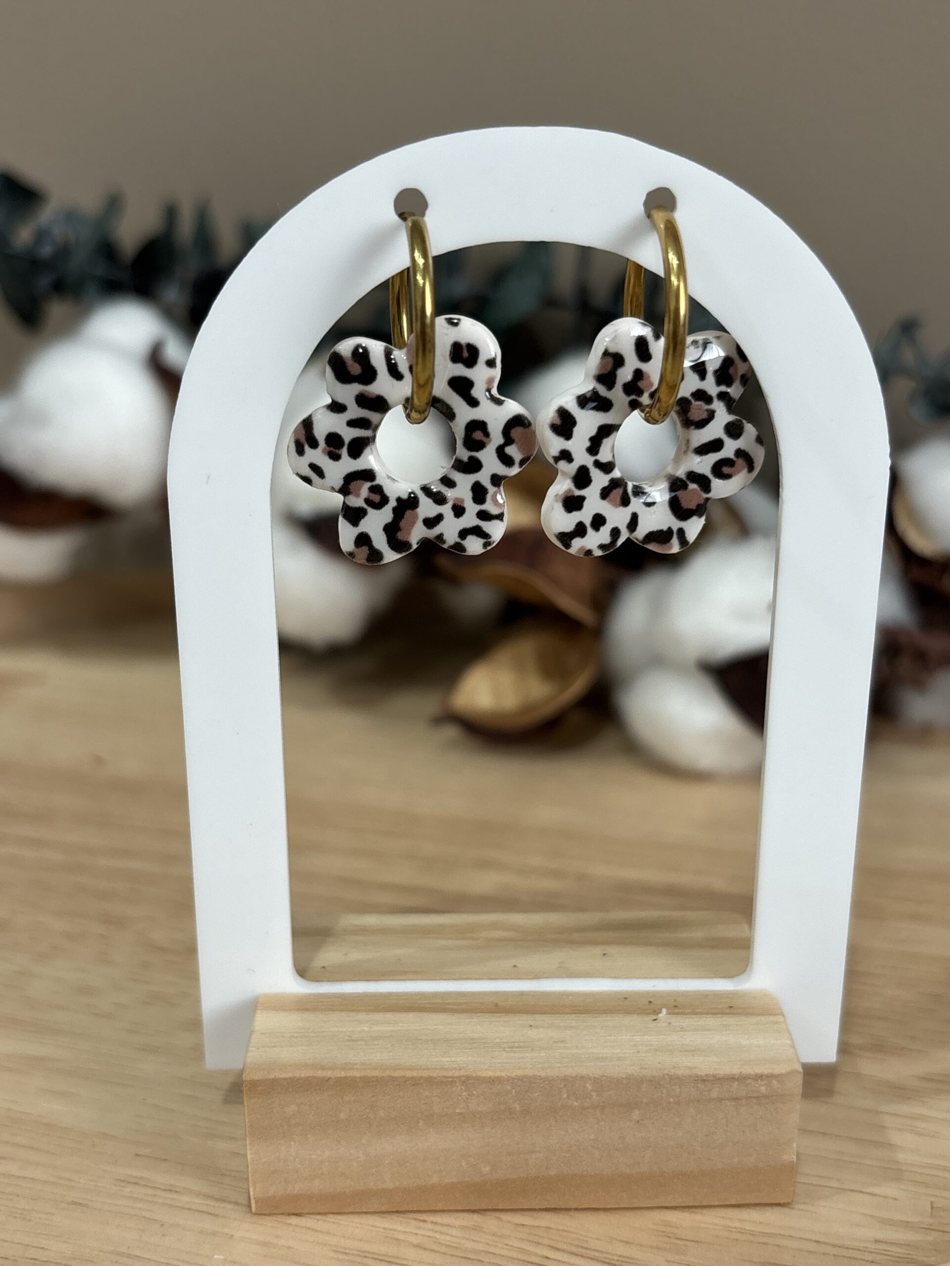 Apportez une touche d’éclat et de fantaisie à vos tenues avec nos boucles d’oreilles pampilles Isya en forme de fleur avec motif léopard.