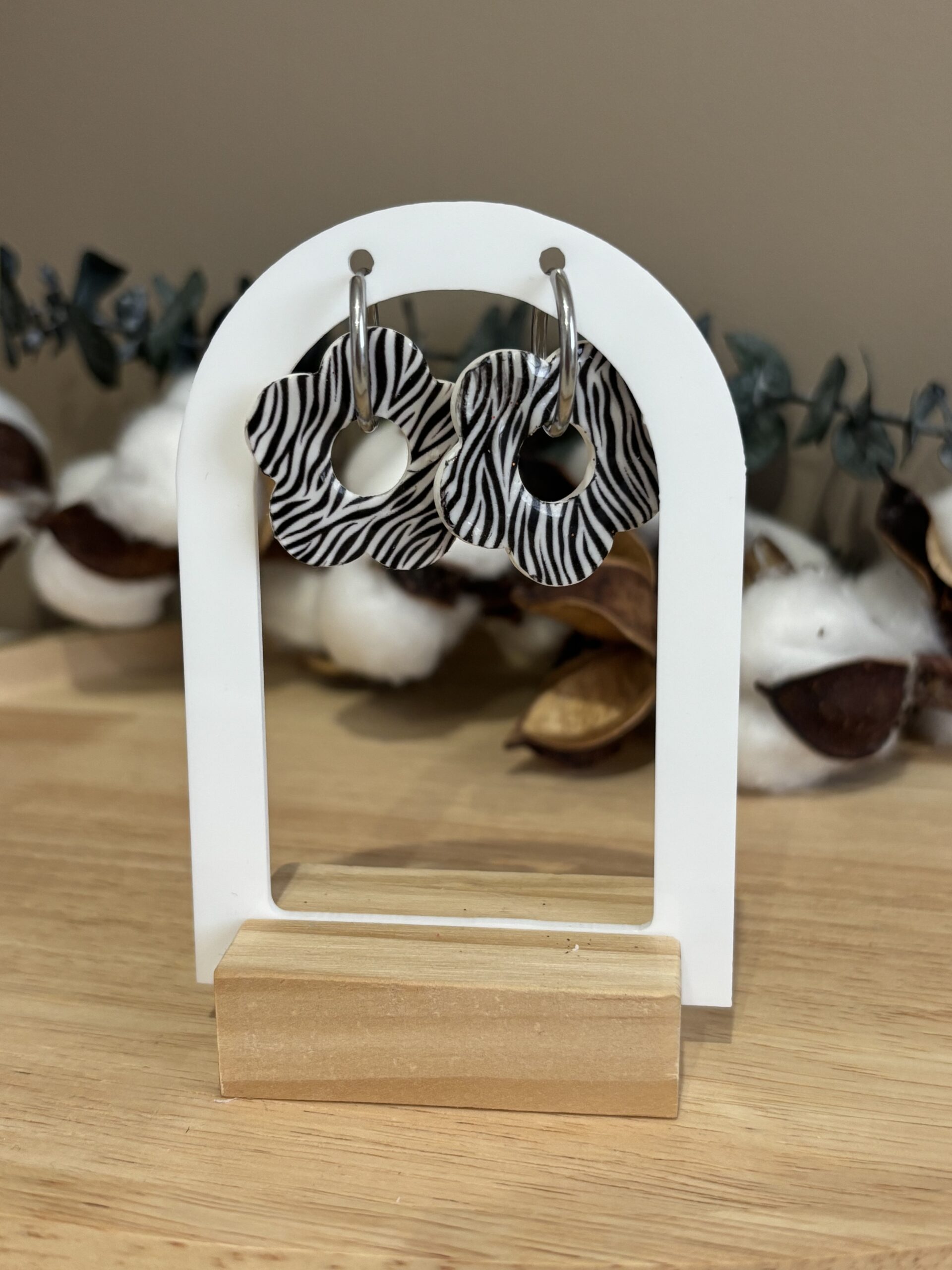 Apportez une touche d’éclat et de fantaisie à vos tenues avec nos boucles d’oreilles pampilles Kaïa en forme de fleur et motif zèbre.