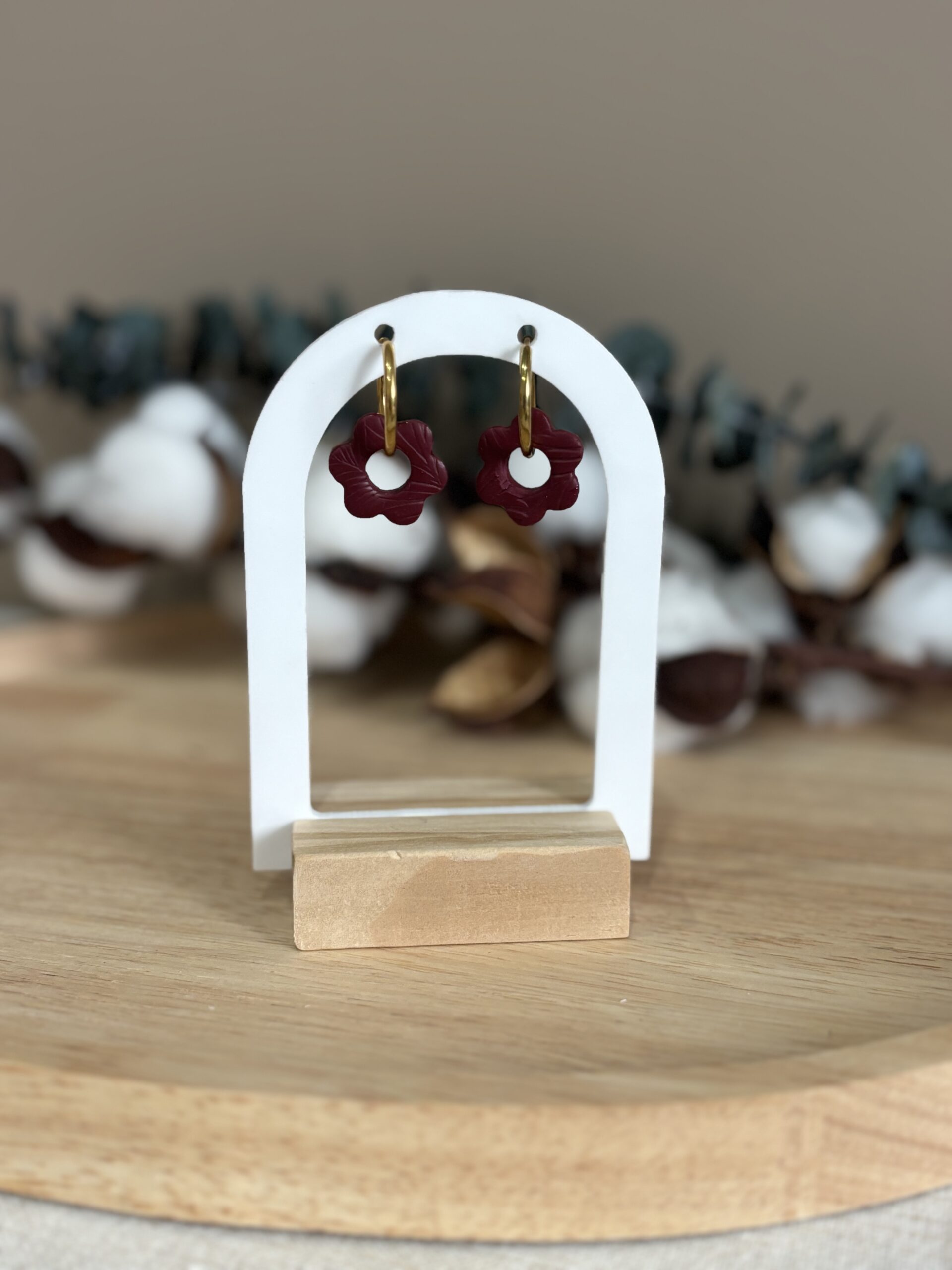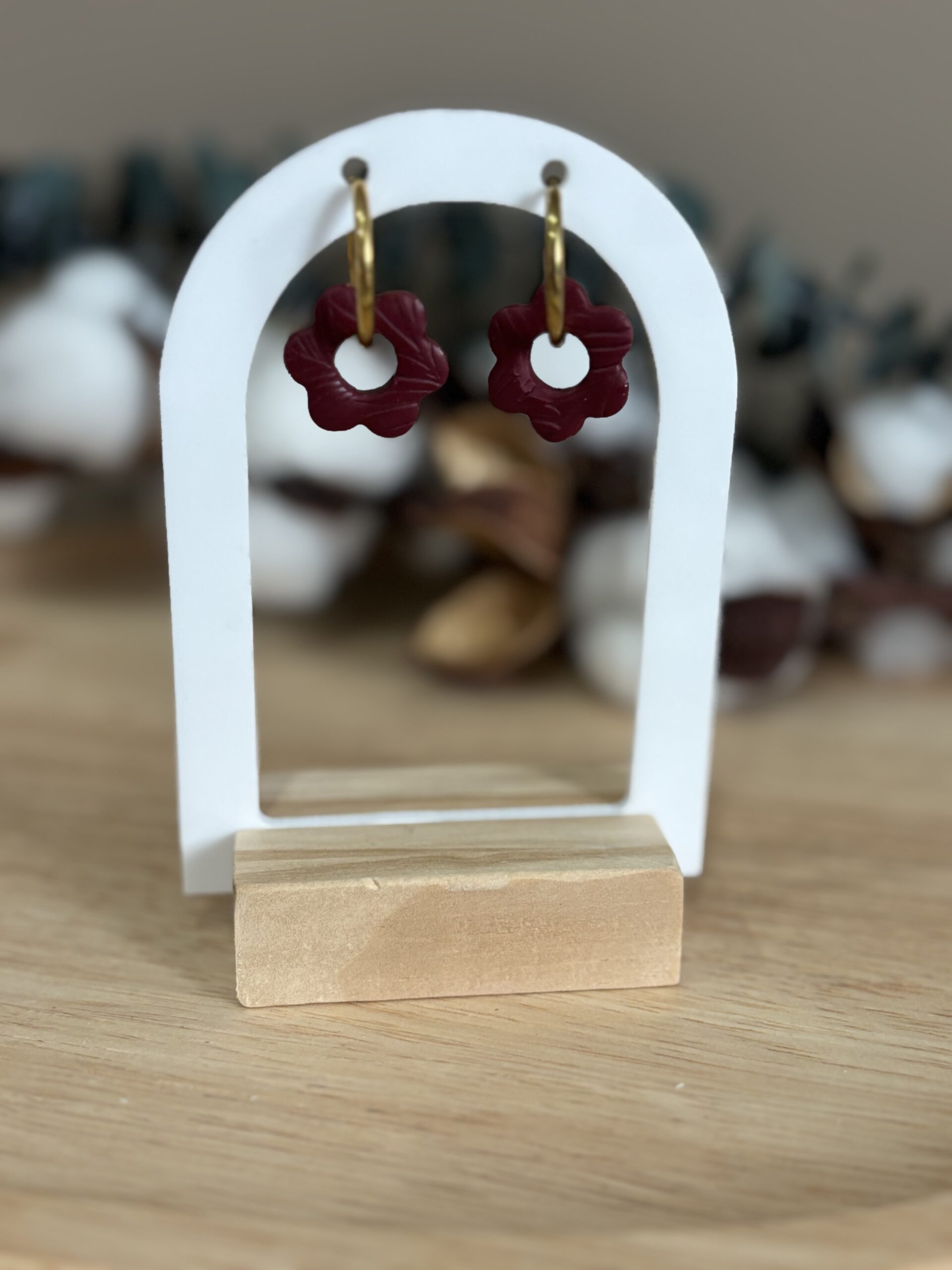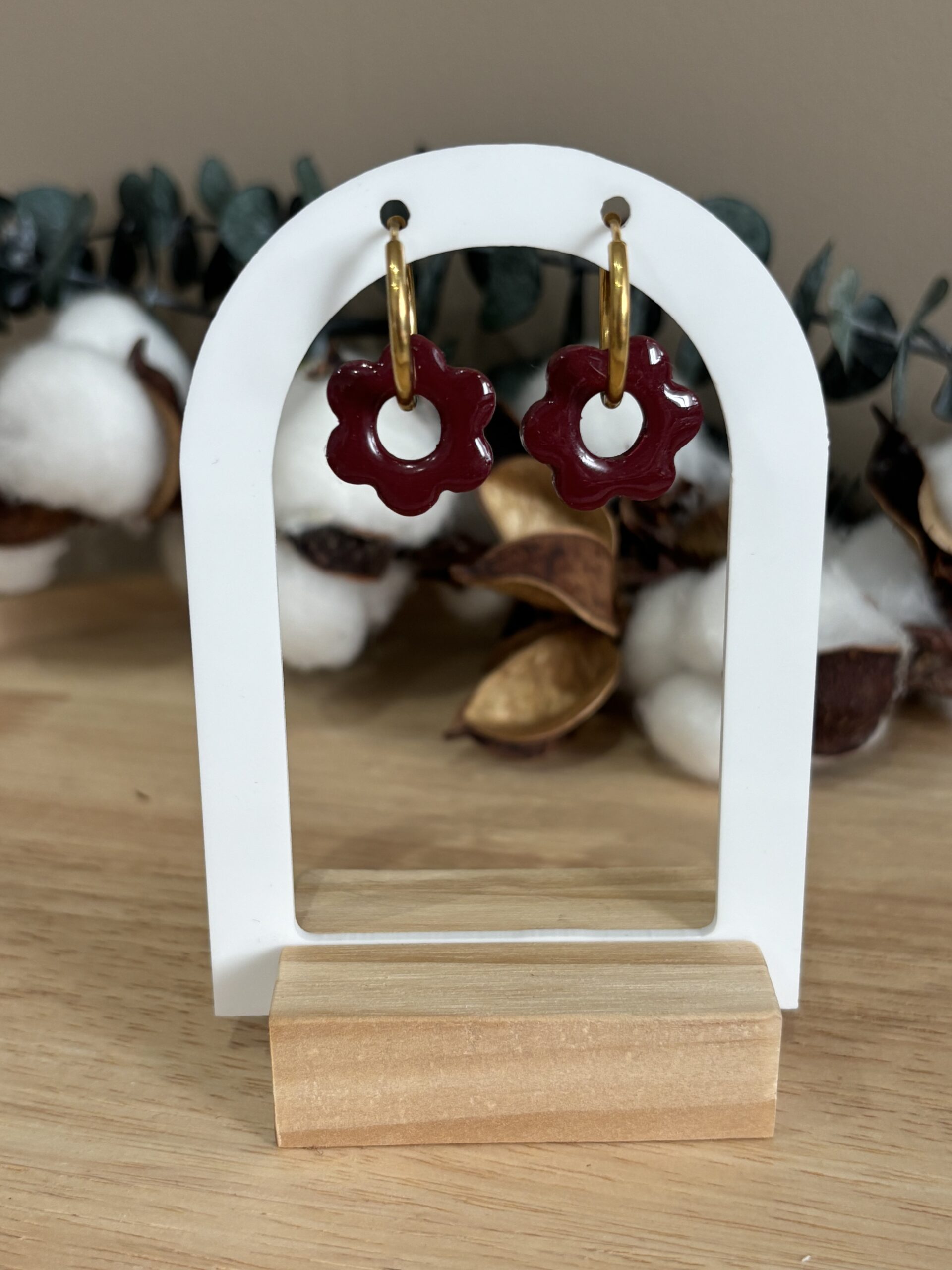 Apportez une touche d’éclat et de fantaisie à vos tenues avec nos boucles d’oreilles pampilles Maë en forme de petite fleur bordeaux avec un côté en relief mat et un côté en résine.