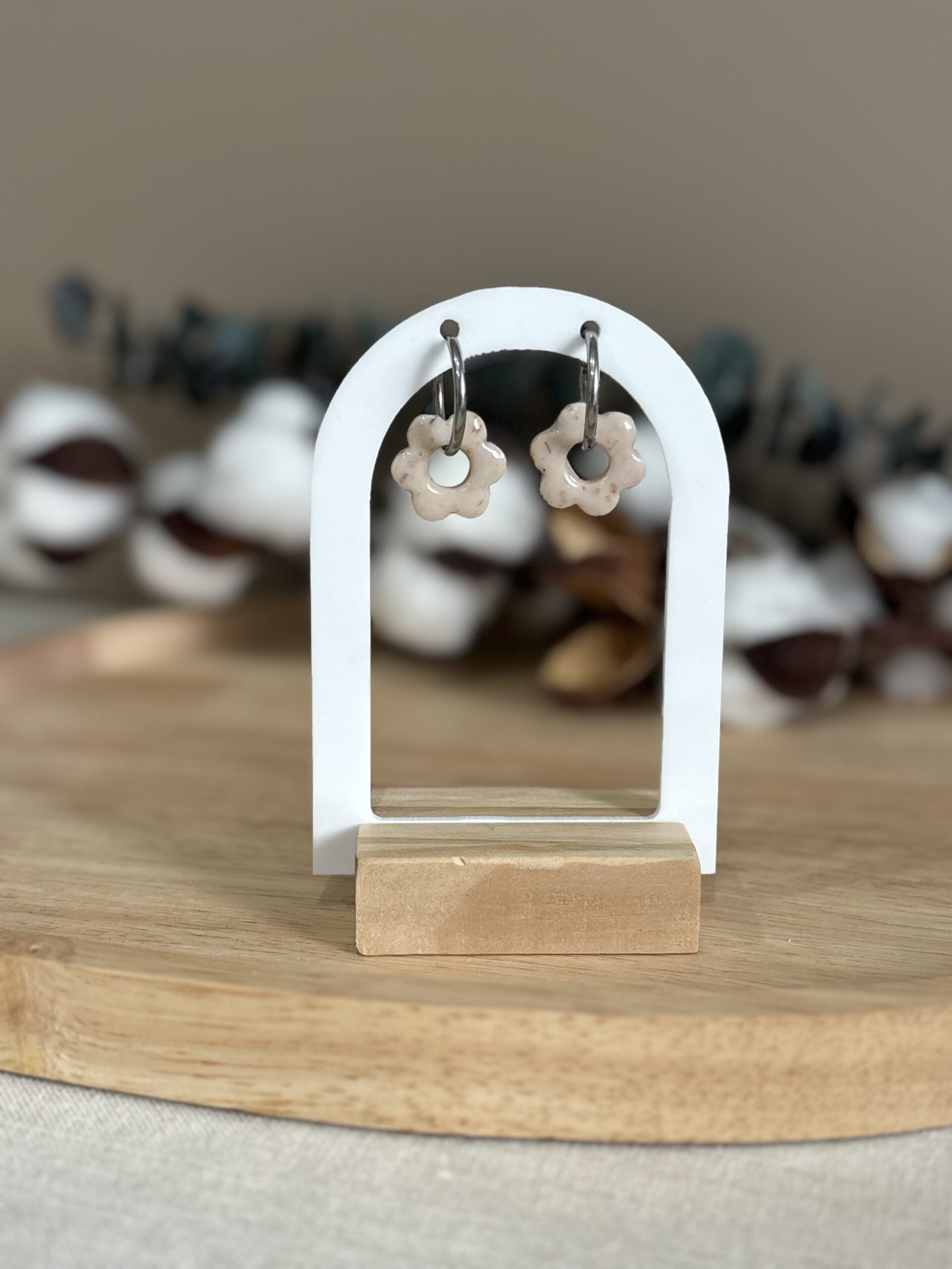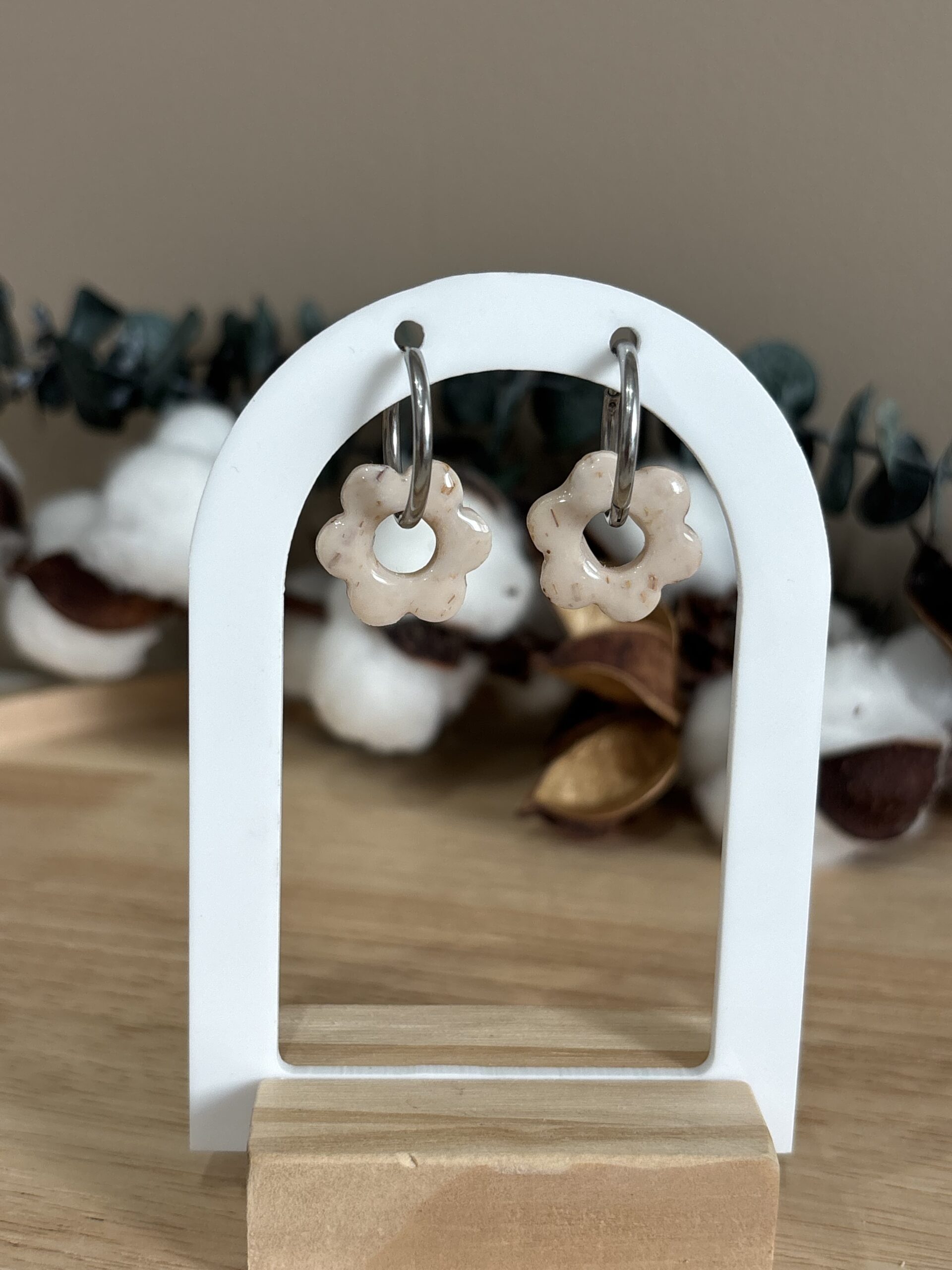 Apportez une touche d’éclat et de fantaisie à vos tenues avec nos boucles d’oreilles pampilles Maë en forme de petite fleur beige tacheté.