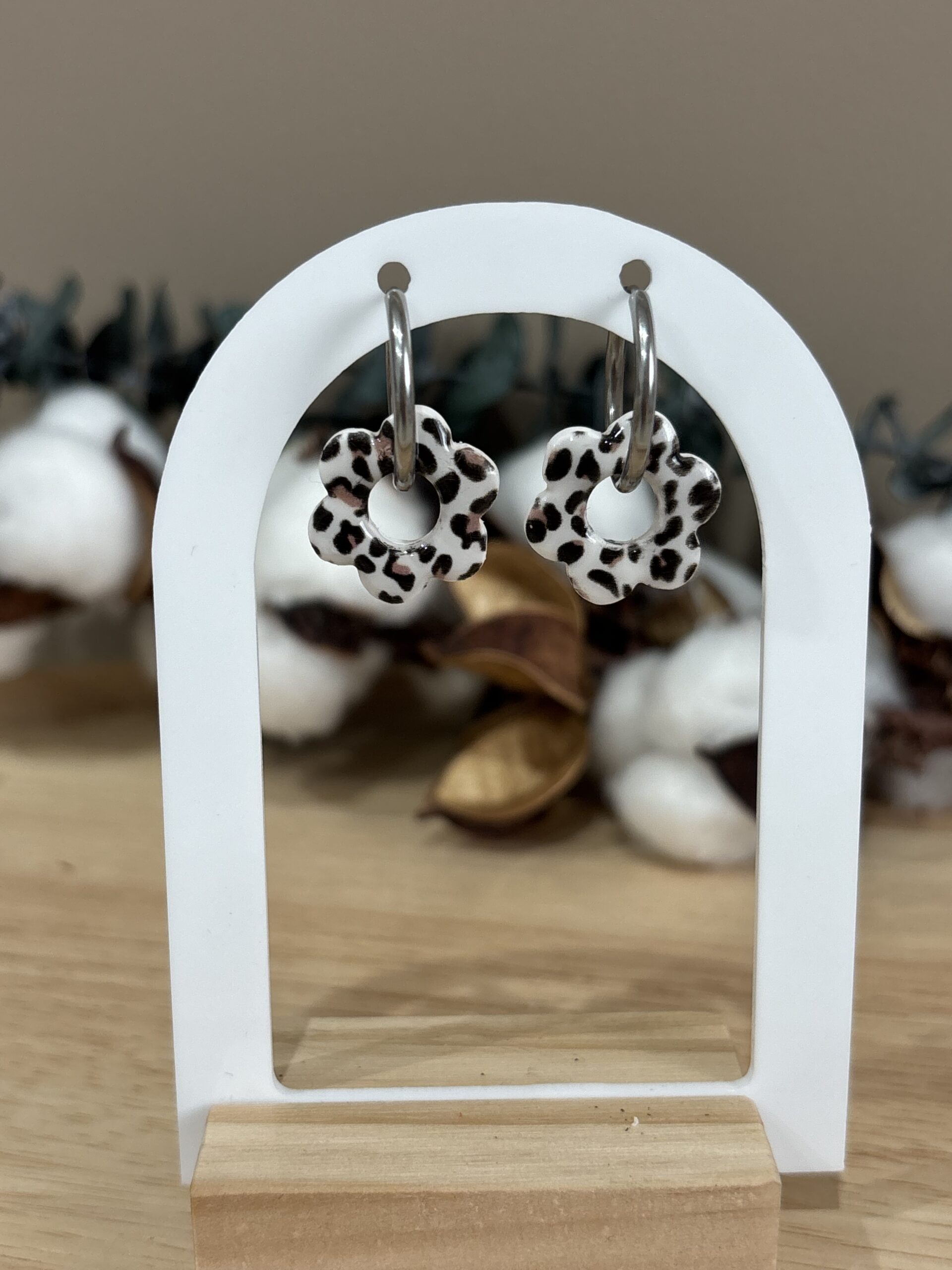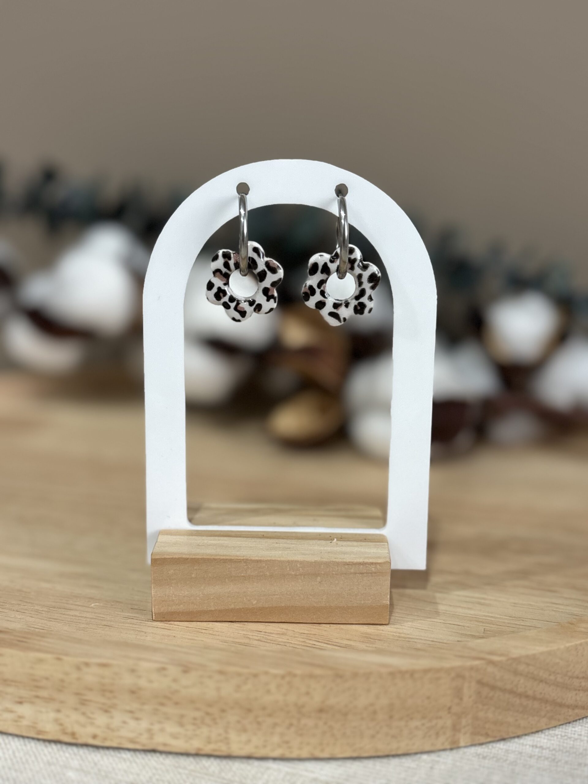 Apportez une touche d’éclat et de fantaisie à vos tenues avec nos boucles d’oreilles pampilles Maë en forme de petite fleur imprimé léopard.
