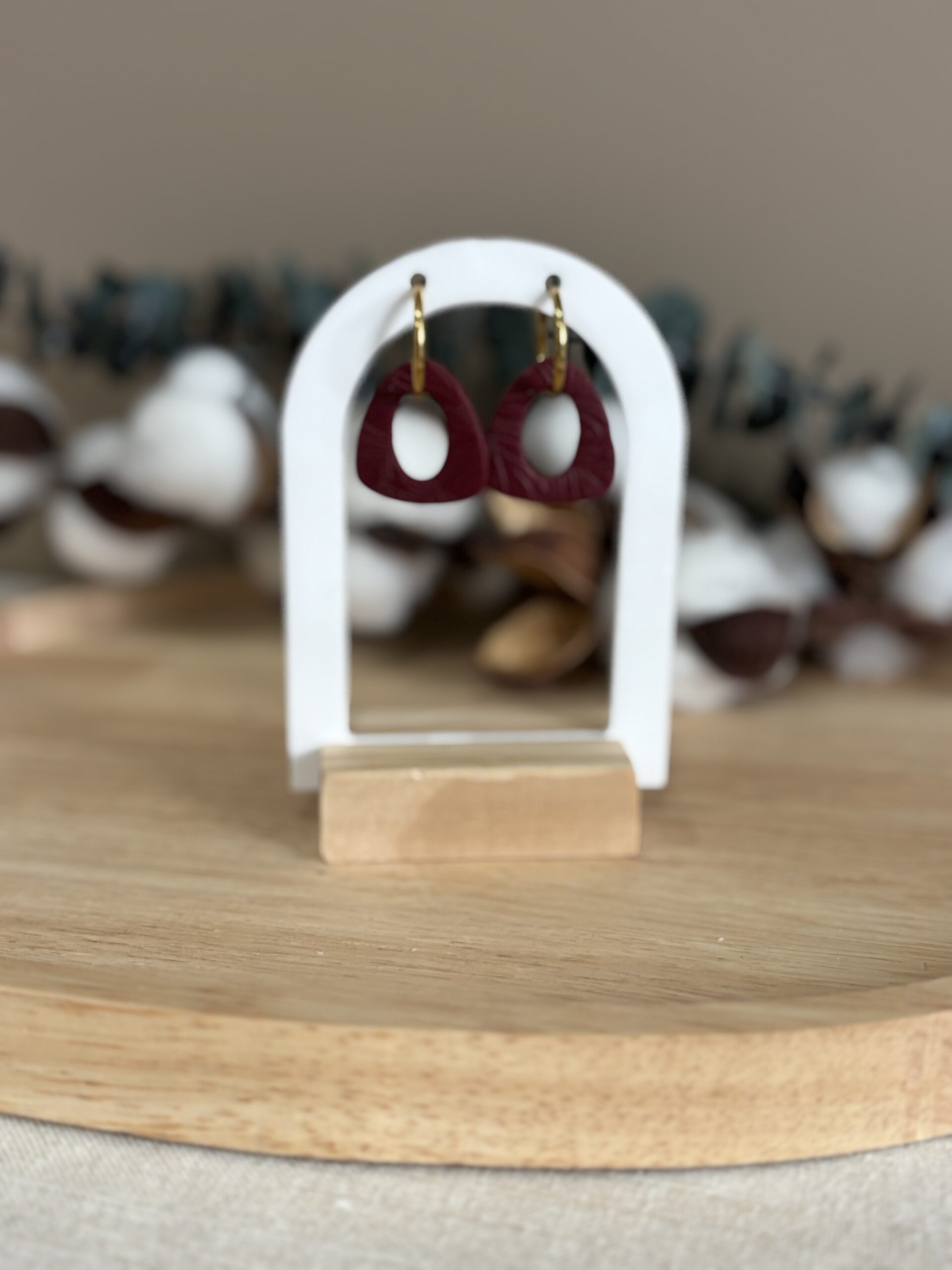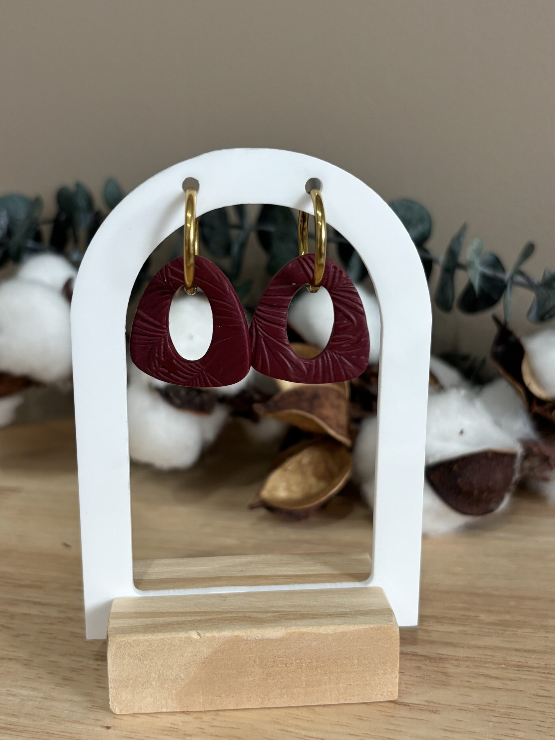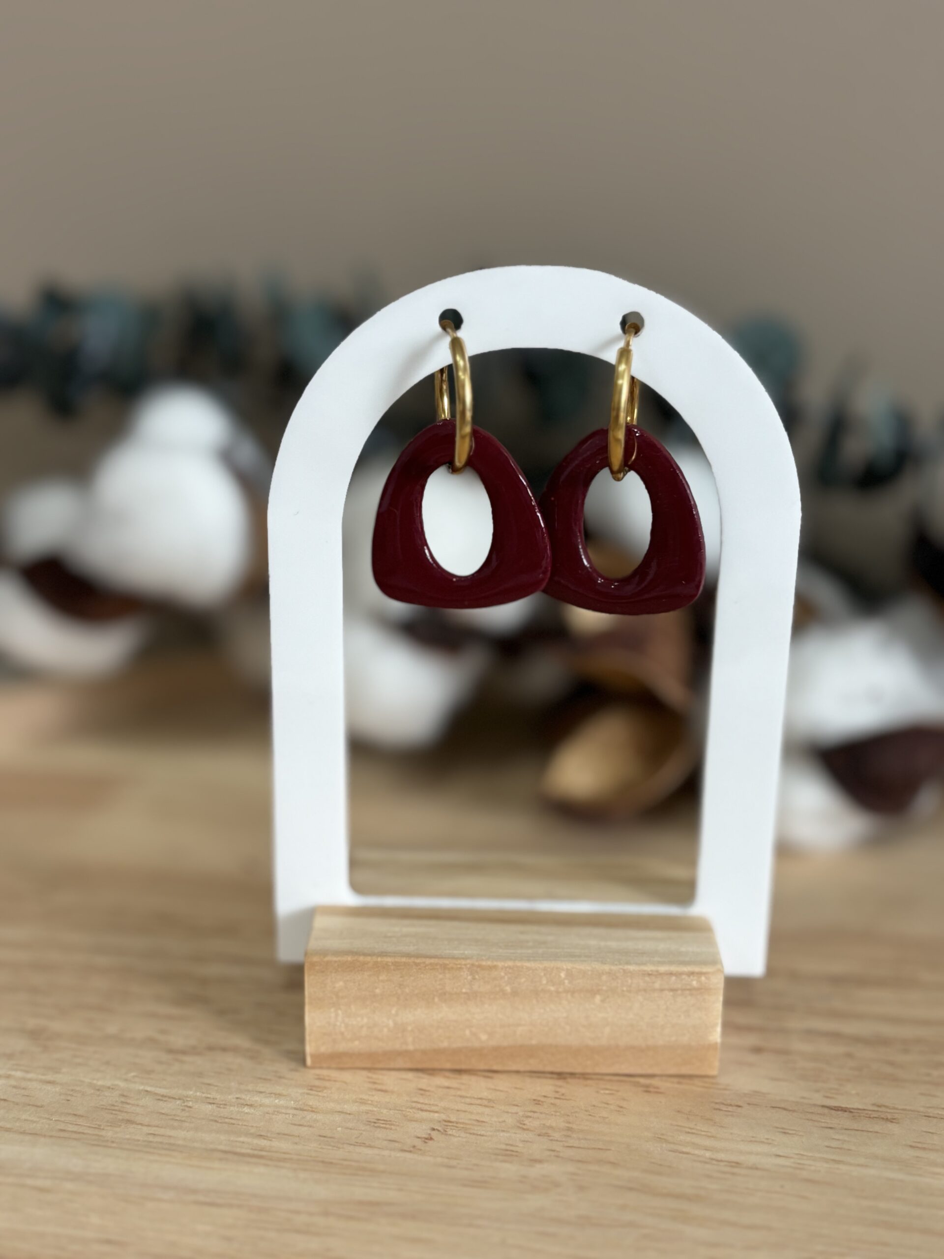Apportez une touche d’éclat et de fantaisie à vos tenues avec nos boucles d’oreilles pampilles Maïa en forme de triangle bordeaux avec un côté en relief mat et un côté en résine.