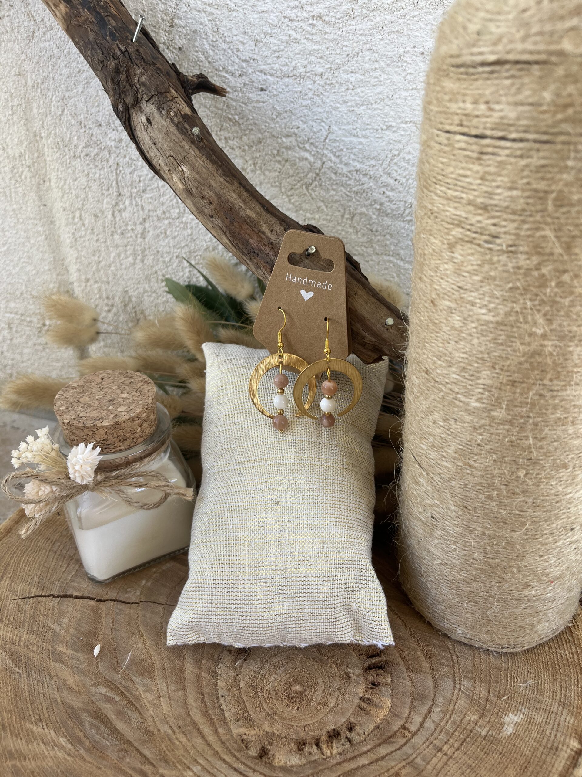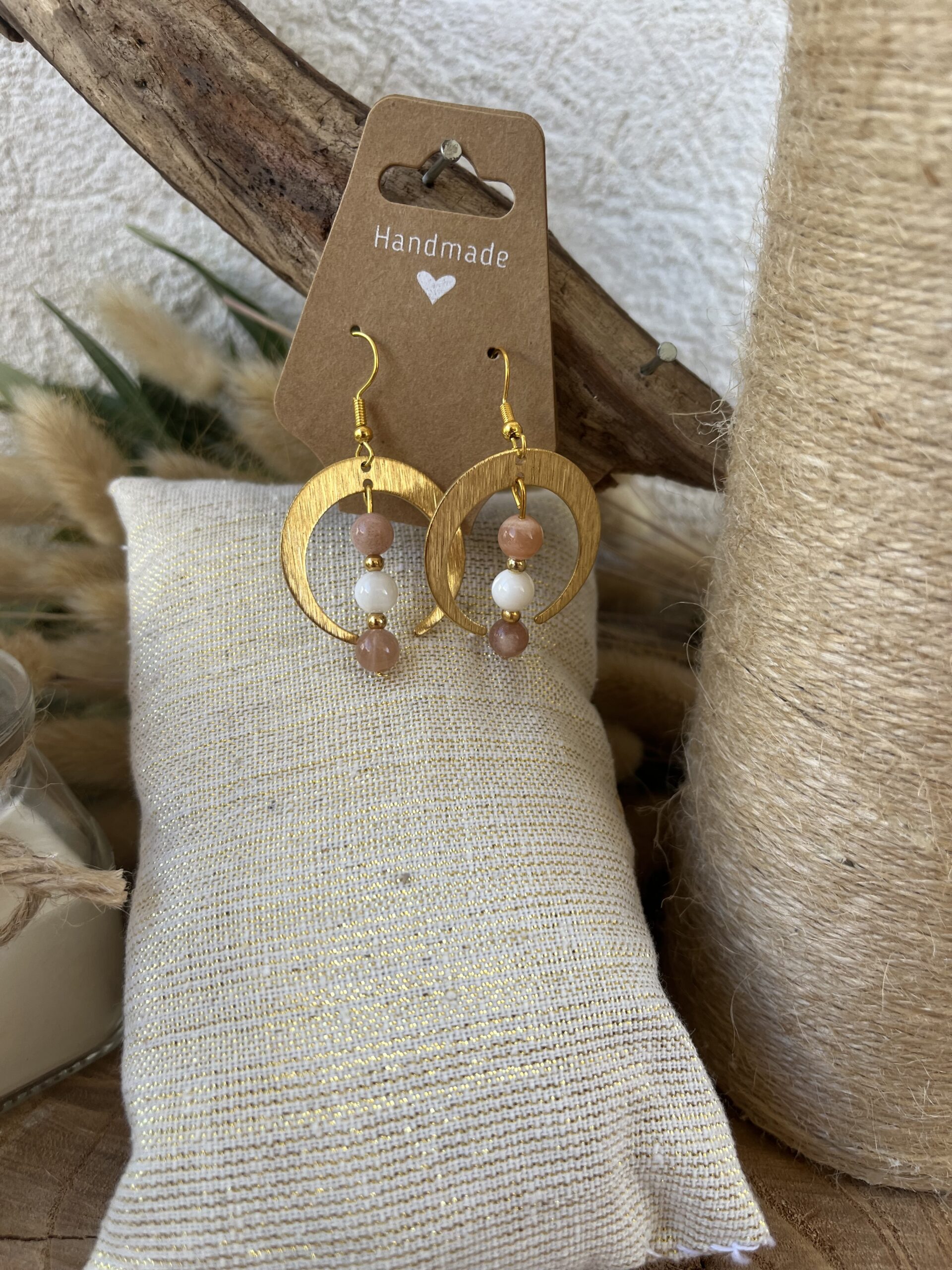 Boucles d’oreilles pendantes en Pierre de Lune perles 6mm avec breloque lune en acier inoxydable finition doré.