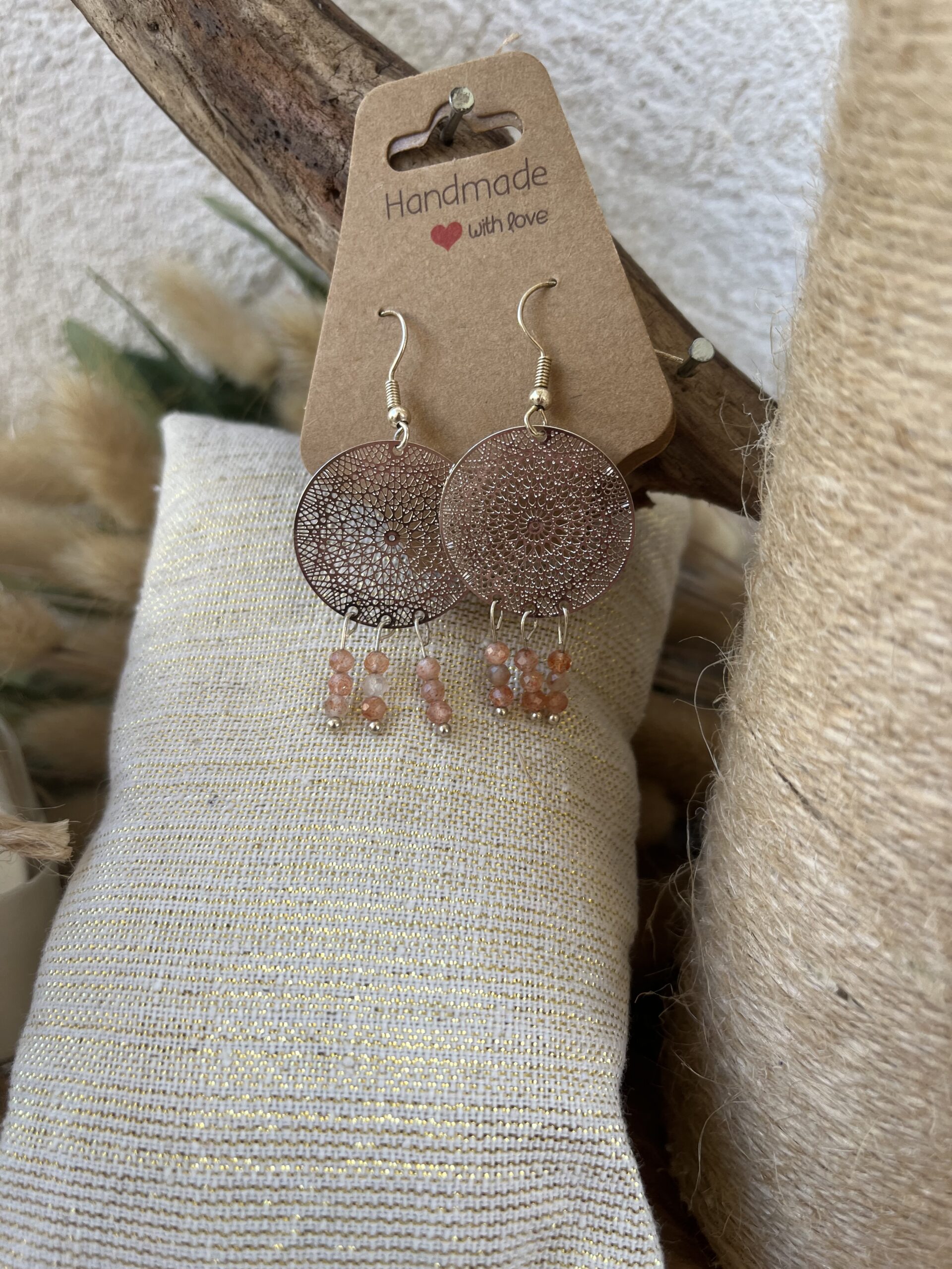 S’agissant d’une création artisanale en pierres naturelles, la couleur, la taille ou les motifs peuvent légèrement varier d’une paire à une autre, ce qui rend chacune d’elle unique.