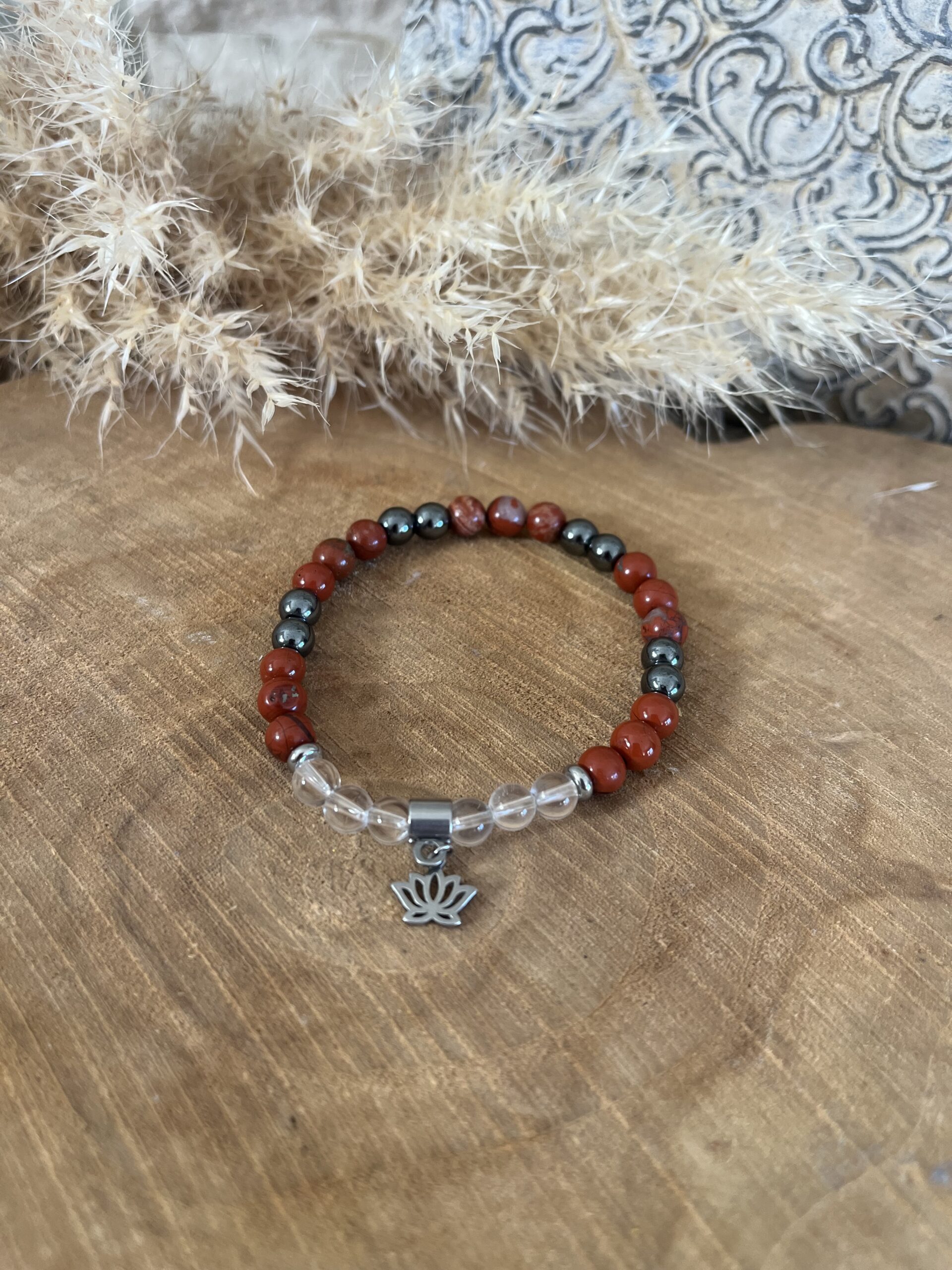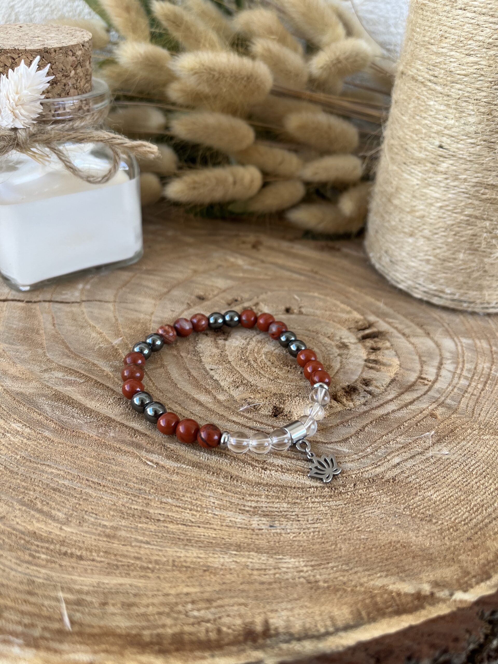 Bracelet avec élastique en pierres naturelles Jaspe rouge, Hématite et Cristal de Roche, perle 6mm avec breloque en acier inoxydable argenté.