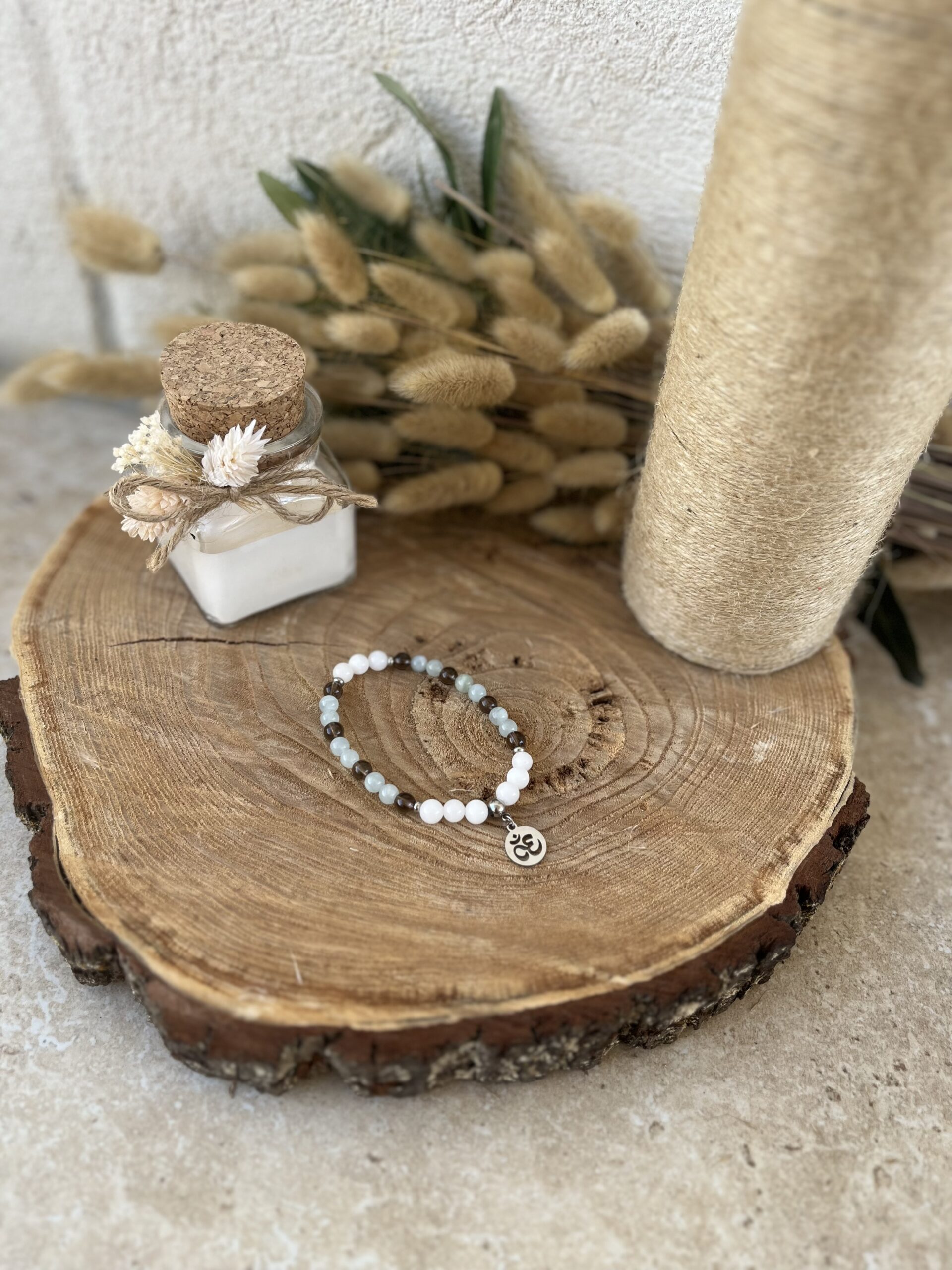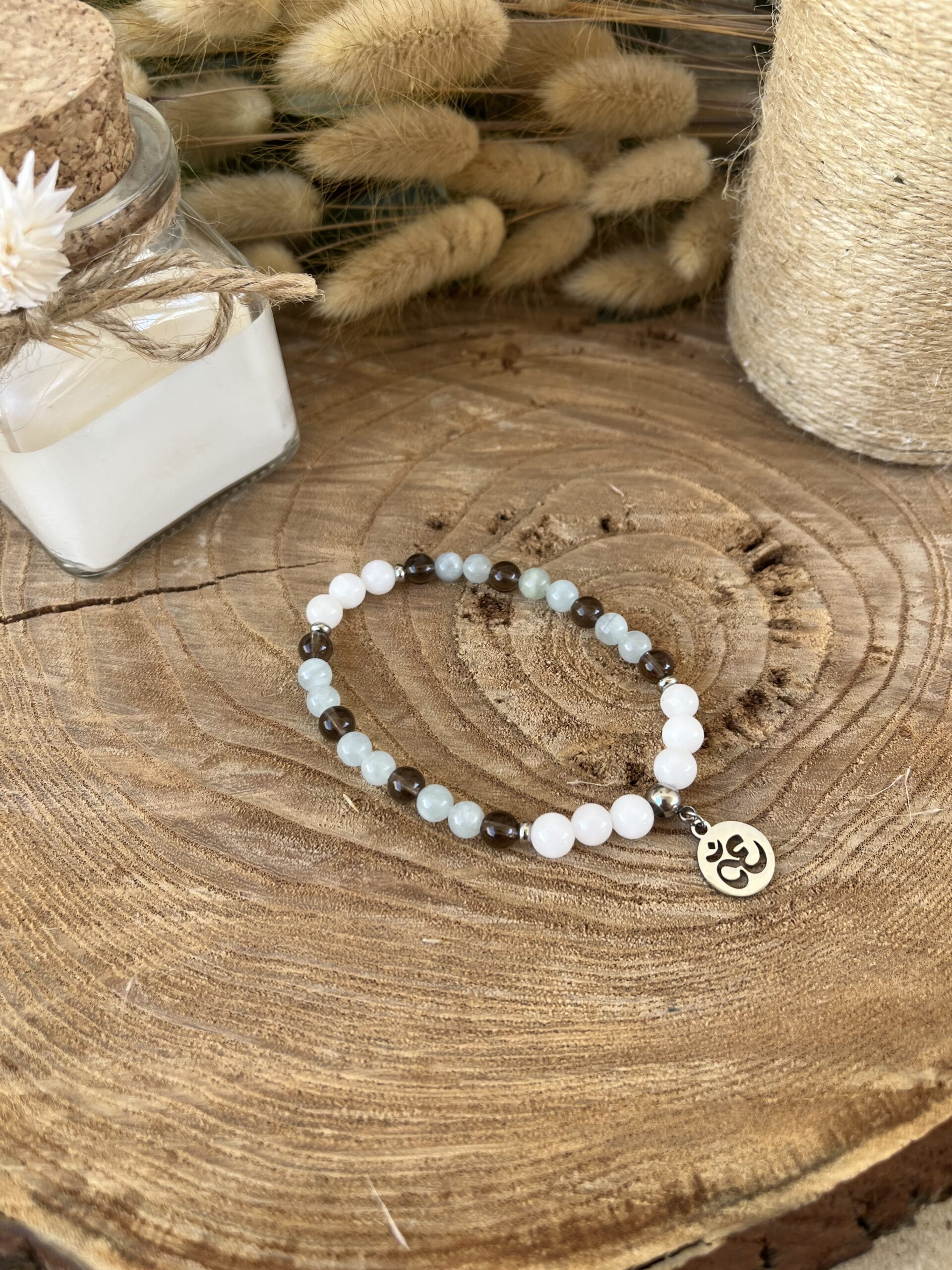 Bracelet avec élastique en pierres naturelles Aigue marine, jade blanc et quartz fumé, perle 6mm avec breloque en acier inoxydable argenté.