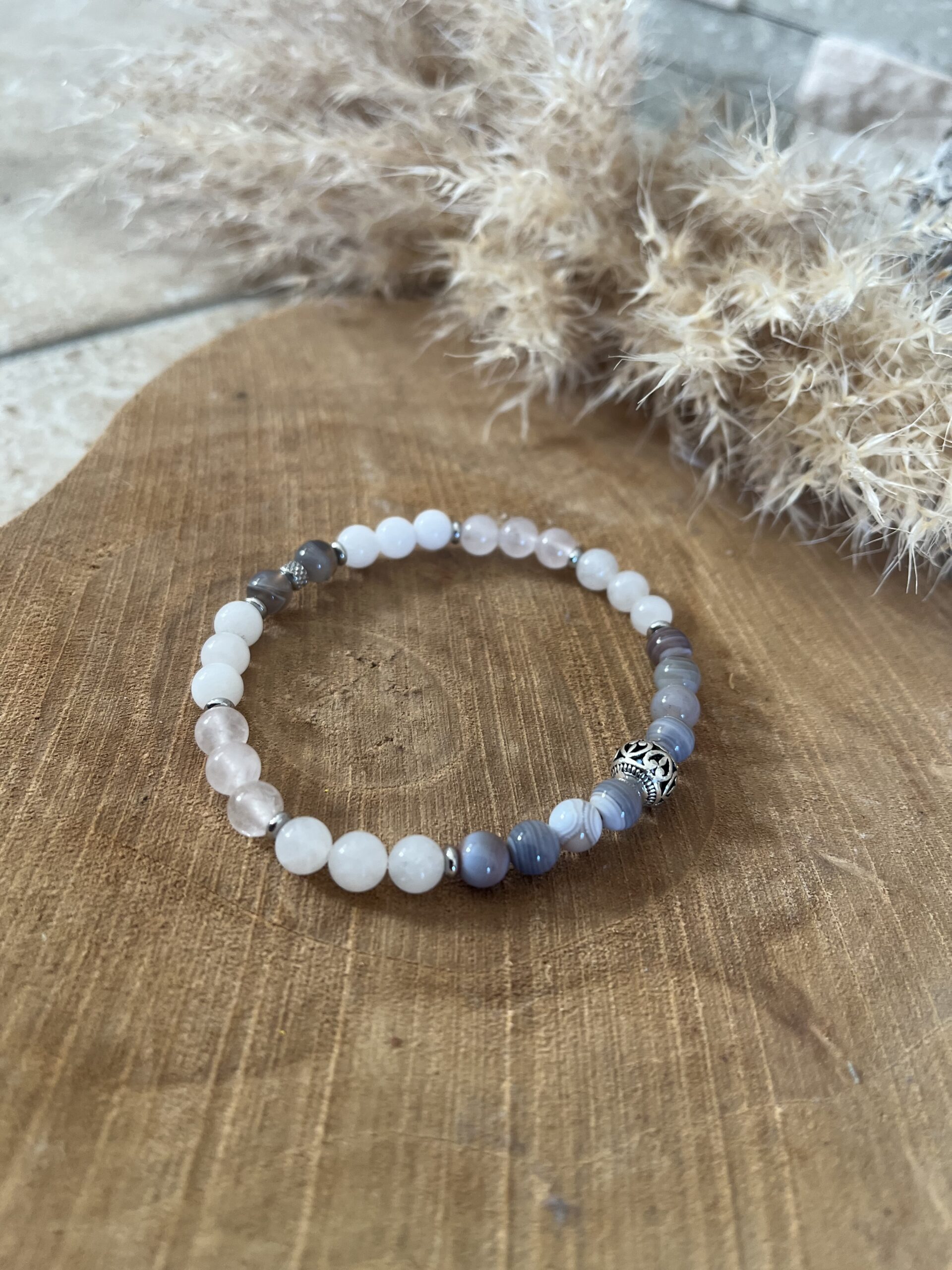Bracelet avec élastique en pierres naturelles Jade blanc, Quartz rose et Agate du Botswana, perle 6mm avec breloque en acier inoxydable finition argenté.