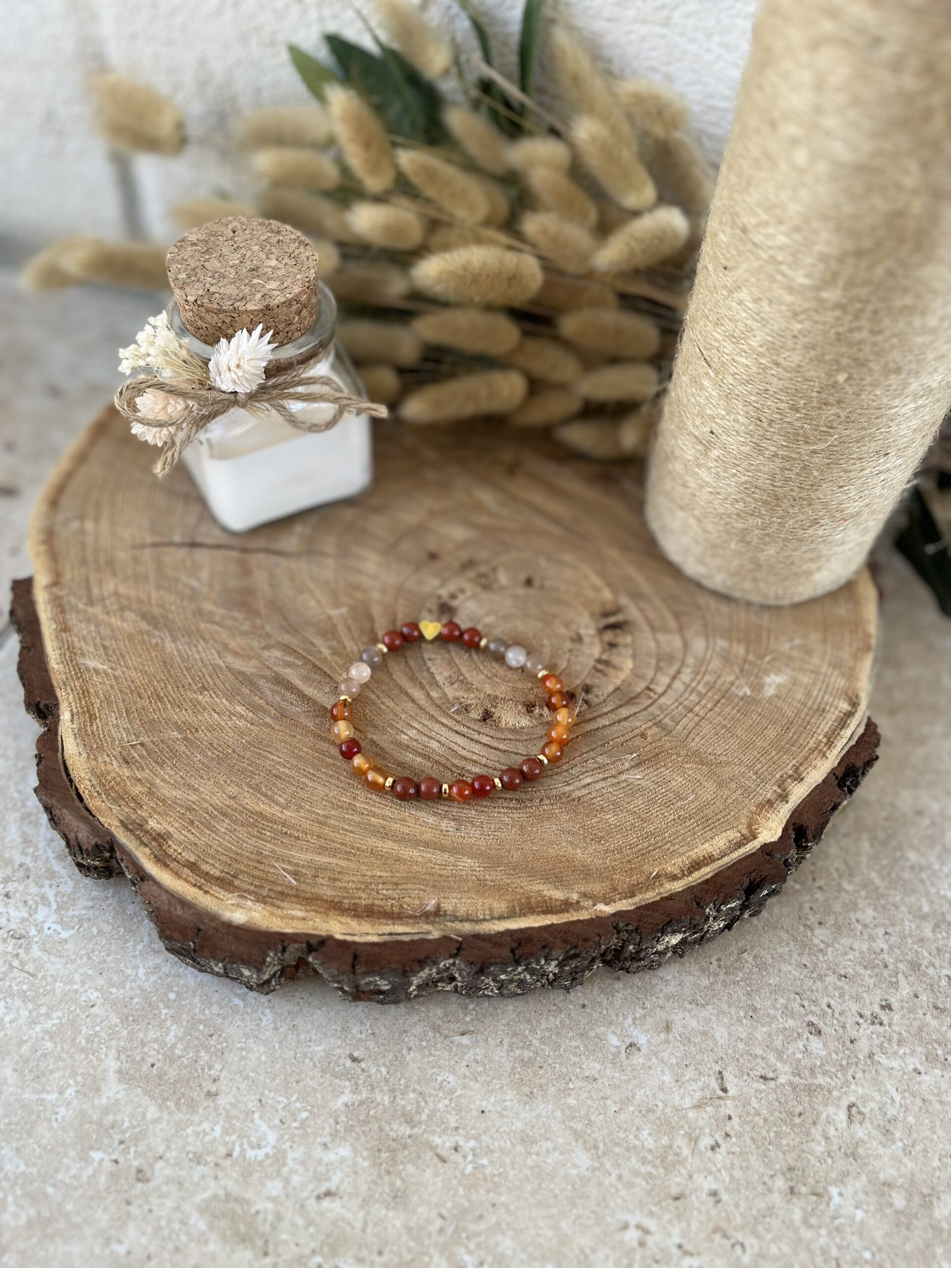 Bracelet avec élastique en pierres naturelles Jaspe rouge, Cornaline et Pierre de lune, perle 6mm avec breloque en acier inoxydable finition doré ou cœur en nacre.