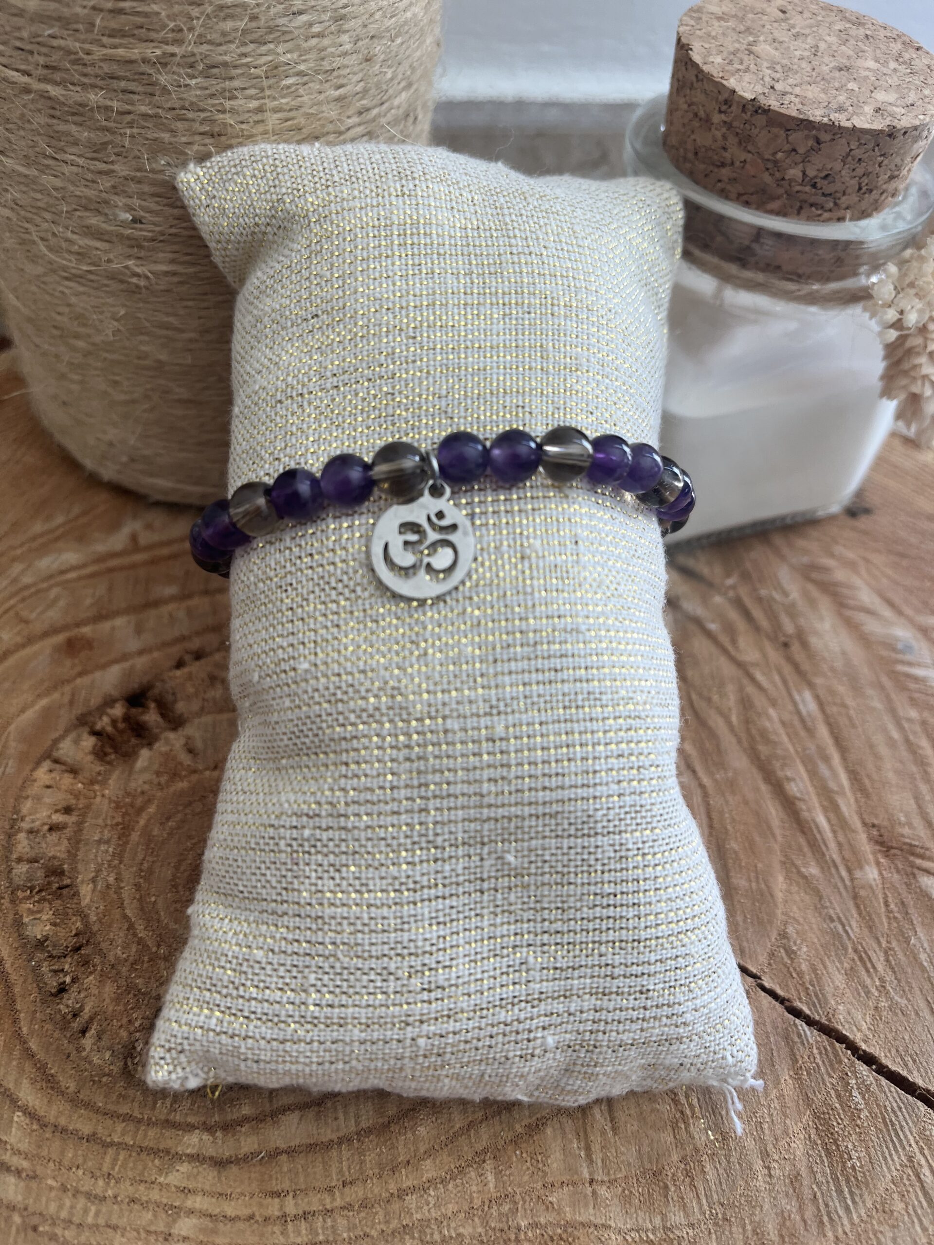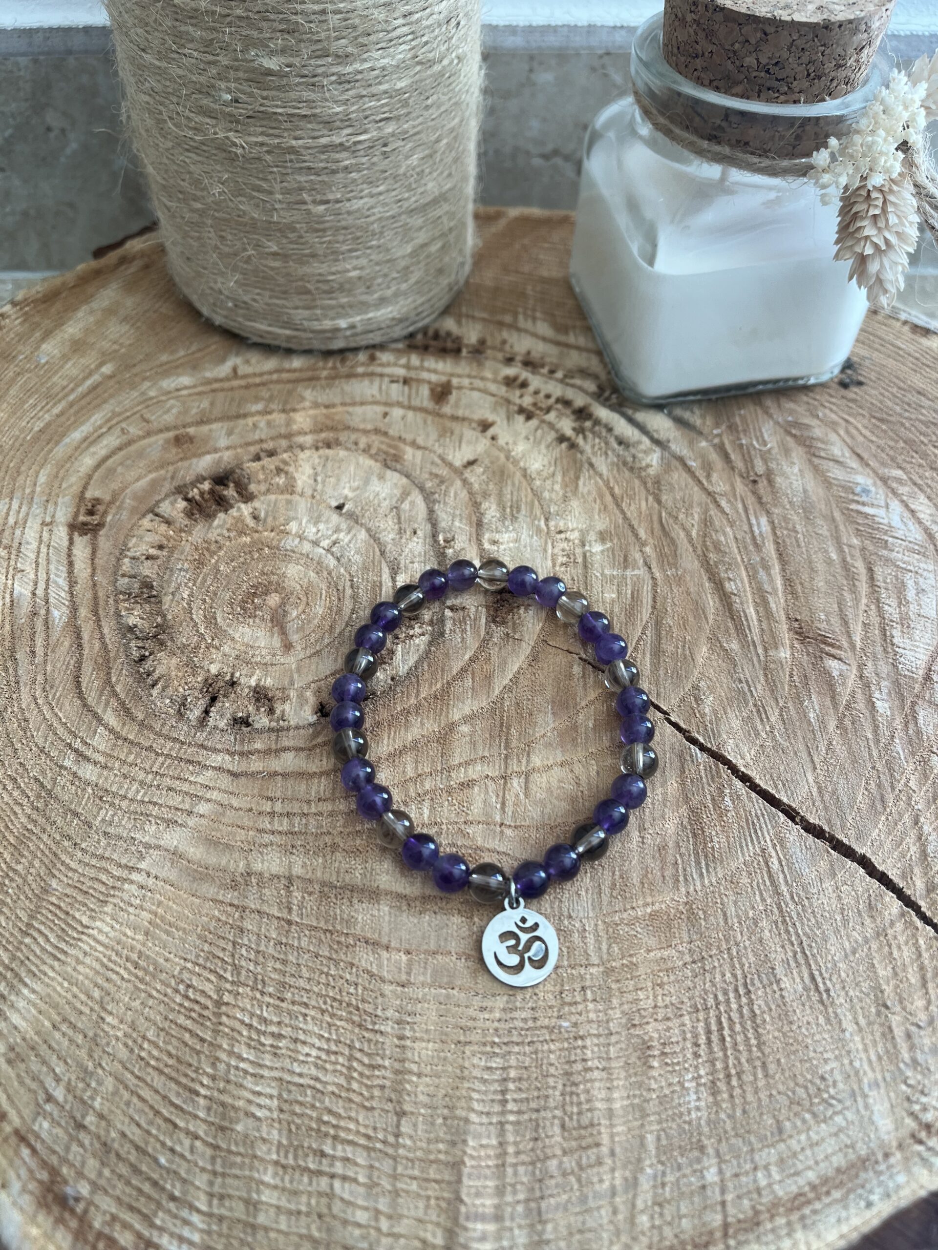 Bracelet avec élastique en pierres naturelles Améthyste et Quartz fumé, perle 6mm avec breloque en acier inoxydable argenté.