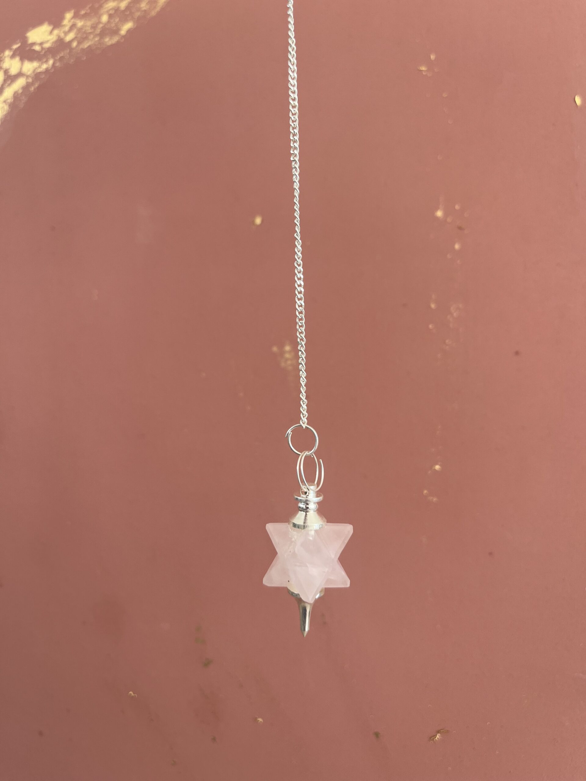Pendule Merkabah en Quartz rose et chaine en acier inoxydable argenté